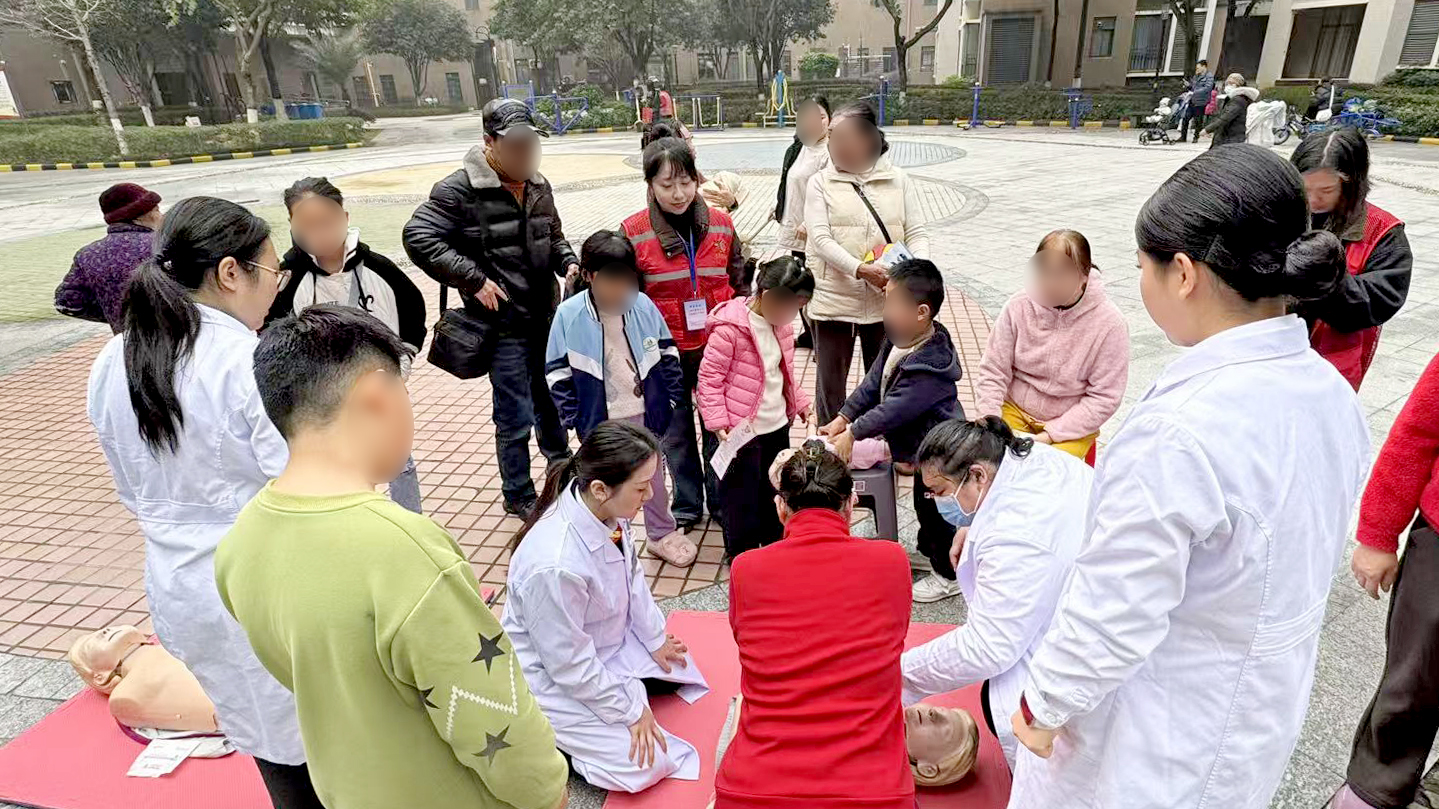 活动现场不仅设立了免费的血压、血糖检测点,帮助居民便捷掌握基础健康指标,还特别设置了急救技能培训环节。医护人员通过模型演示与手把手教学,向社区居民传授成人及儿童心肺复苏术、海姆立克急救法等关键急救技能,有效提升了居民的健康素养与应对突发状况的自救互救能力。