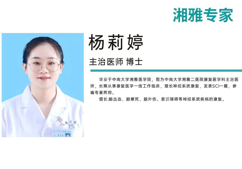杨莉婷博士是神经康复领域骨干专家,毕业于中南大学湘雅医学院。她长期深耕康复医学临床一线,兼具扎实专业功底与丰富临床经验,并发表SCI论文1篇、参编专著2部。