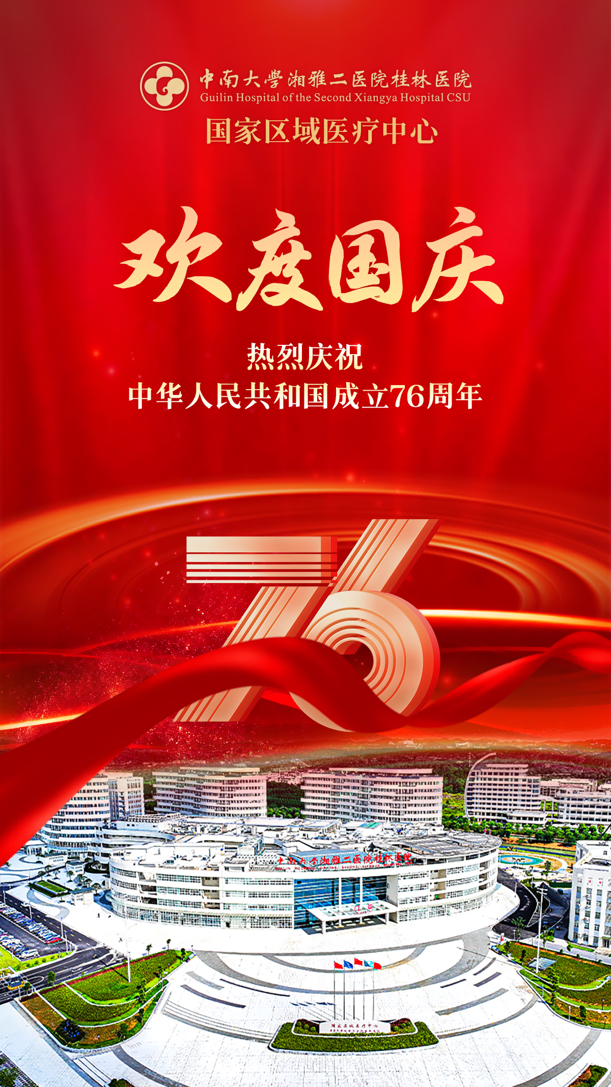 七十六载壮阔历程,初心不改;七十六载辉煌成就,使命在肩。中南大学湘雅二医院桂林医院全体医务工作者以仁心守护健康,以实干献礼华诞!让我们共同祝愿伟大祖国繁荣昌盛、国泰民安,以奋进之姿谱写健康中国新篇章,以温暖医疗守护人民幸福安康!