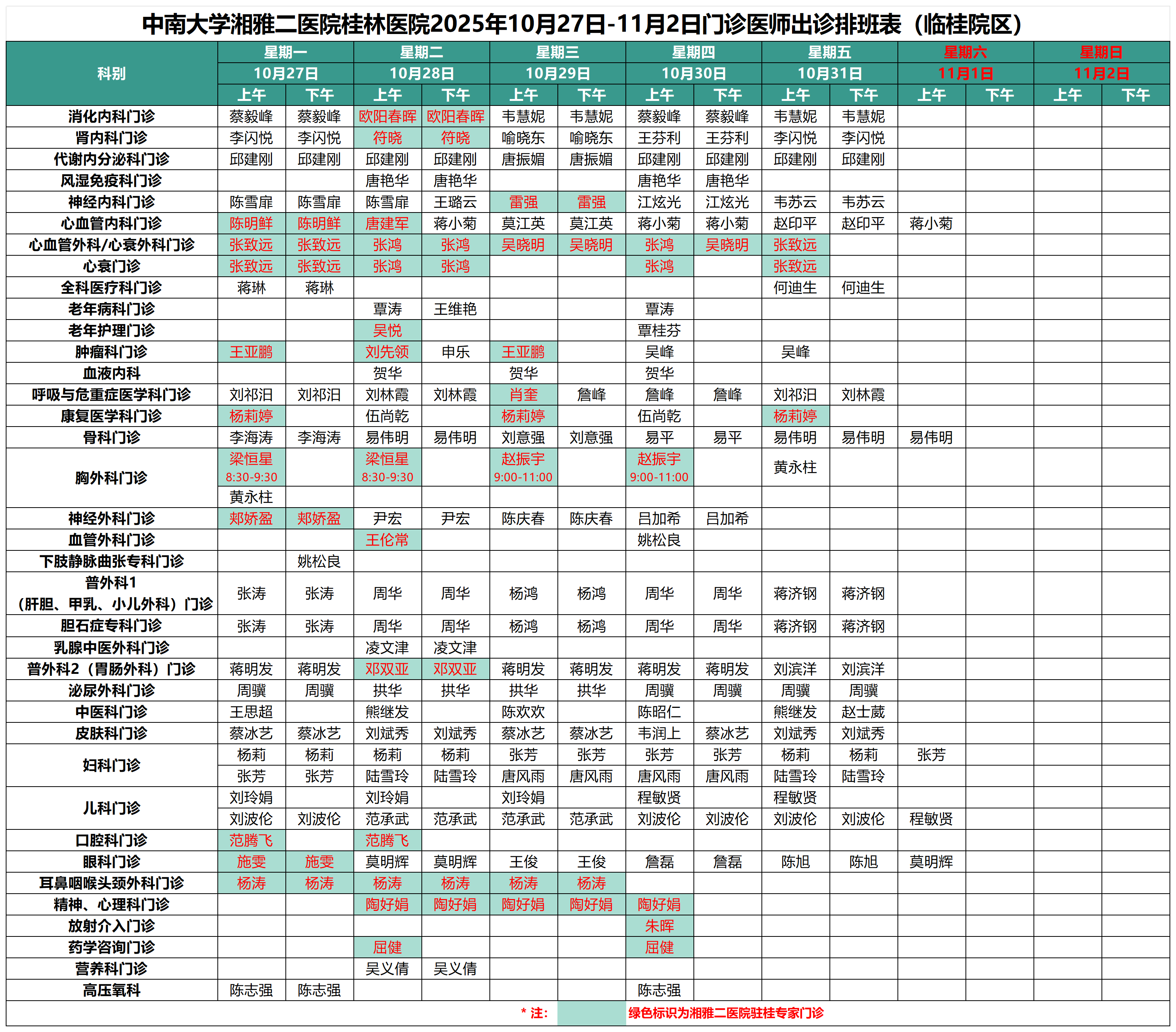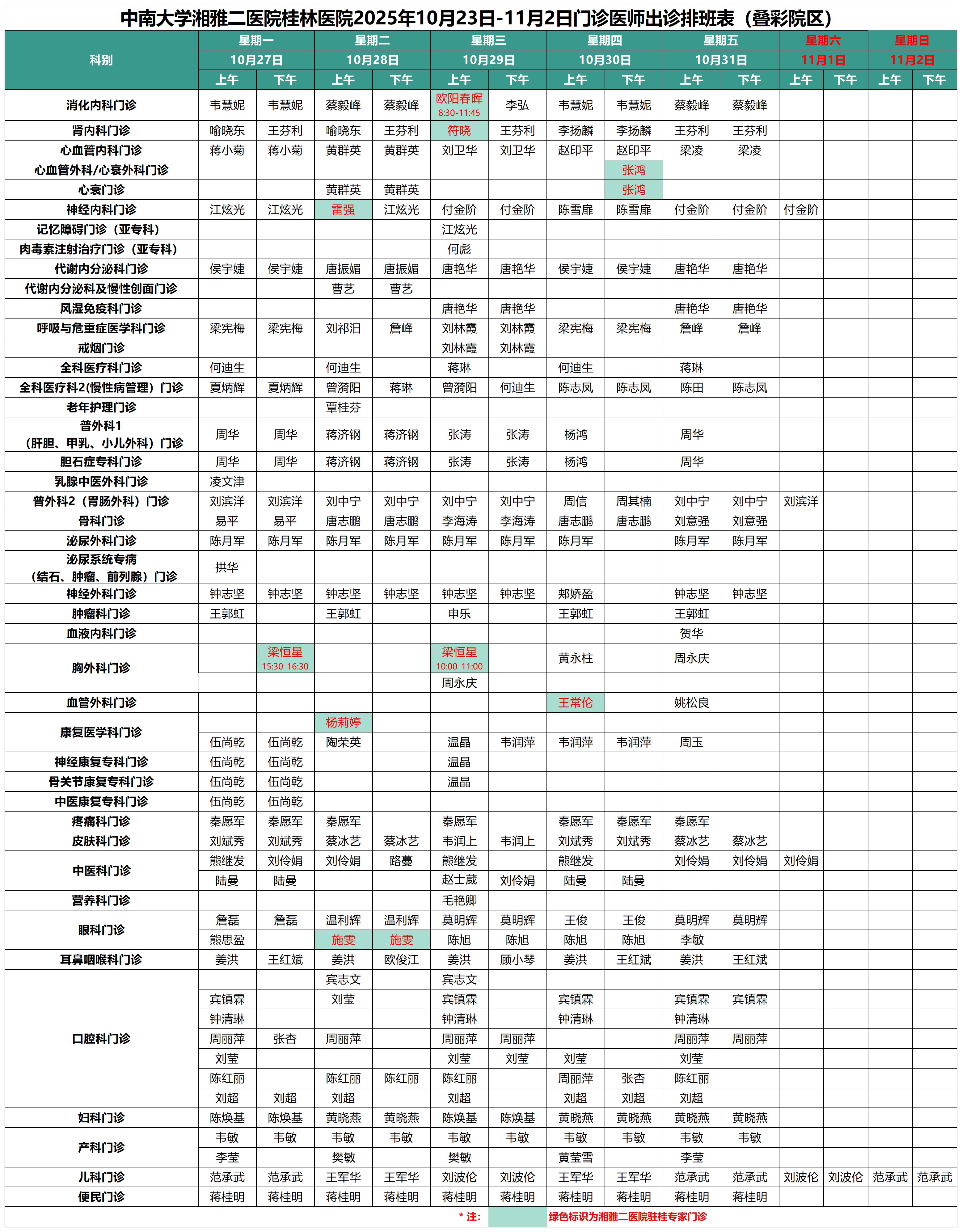 每周更新丨中南大学湘雅二医院桂林医院最新门诊出诊安排(10.27-11.2)