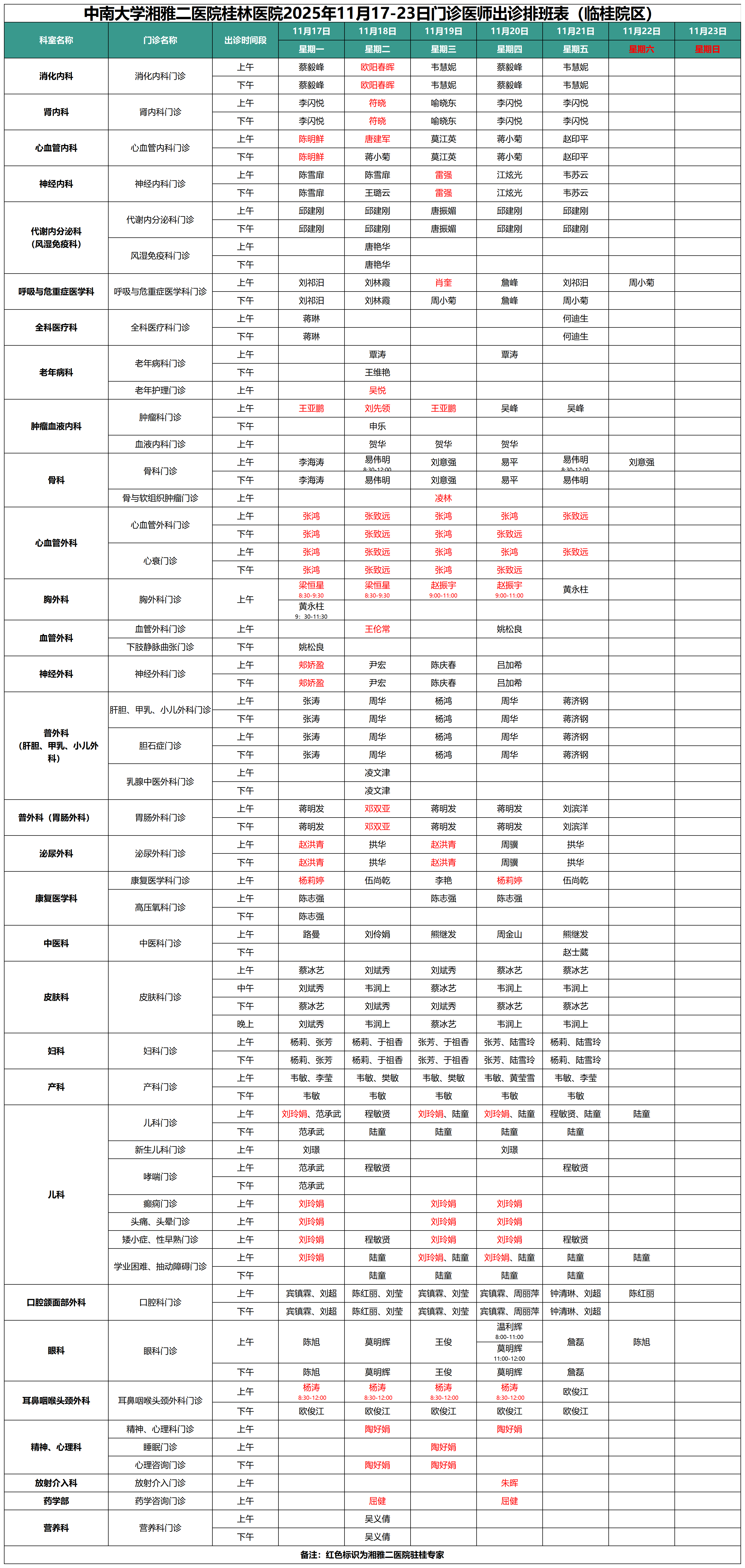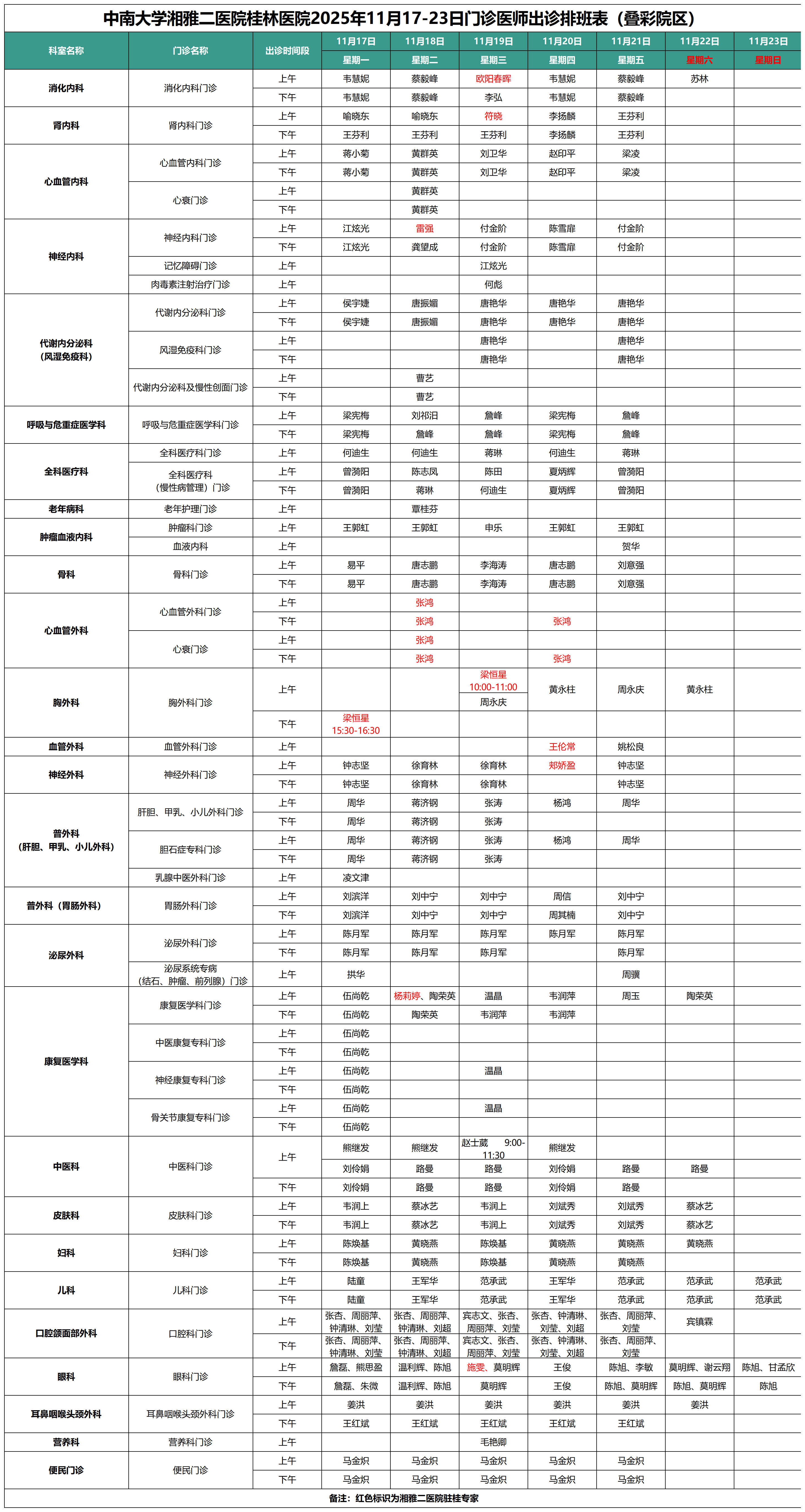 每周更新丨中南大学湘雅二医院桂林医院最新门诊出诊安排(11.17-11.23)