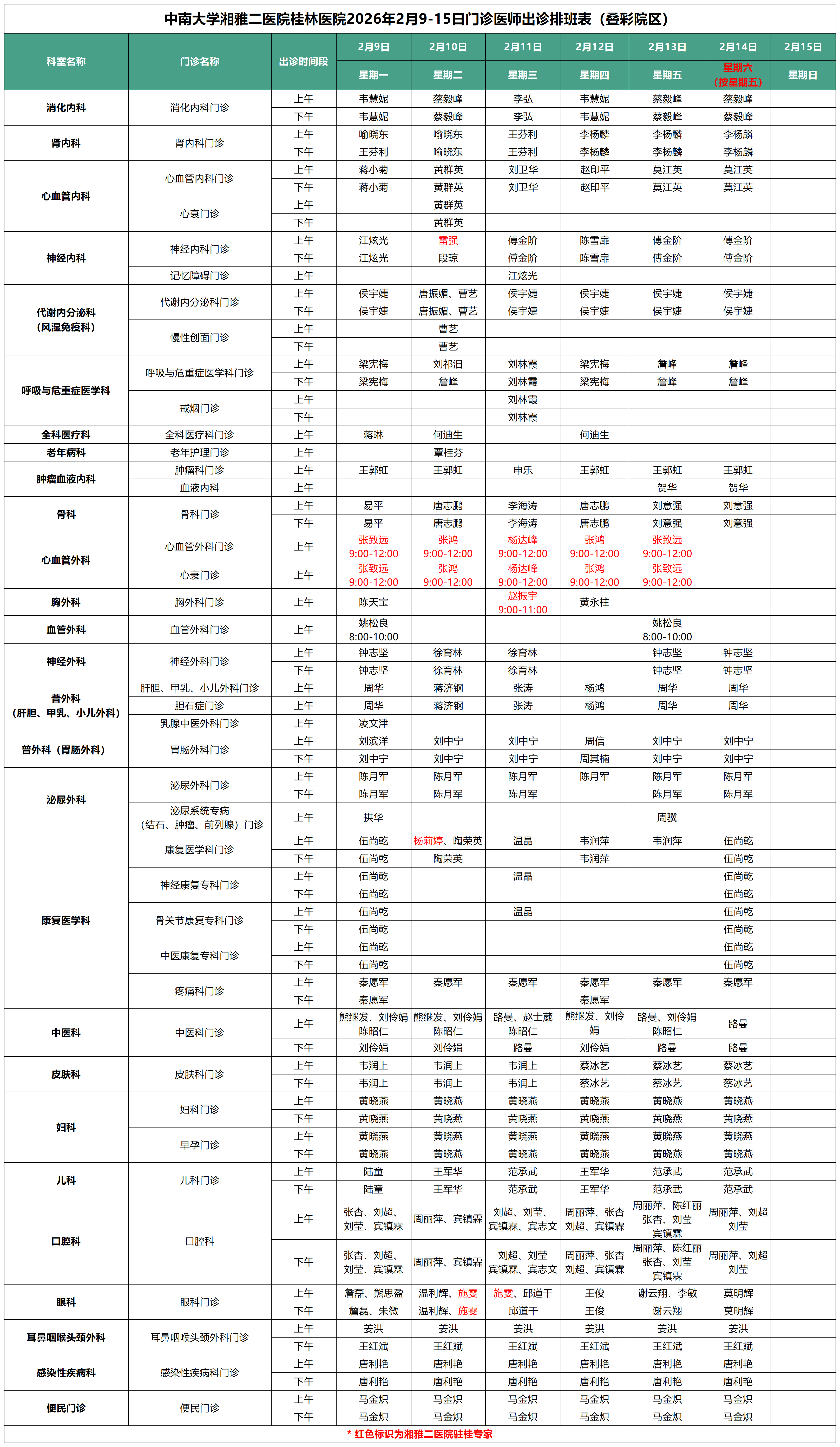 每周更新丨中南大学湘雅二医院桂林医院最新门诊出诊安排(2.9-2.15)