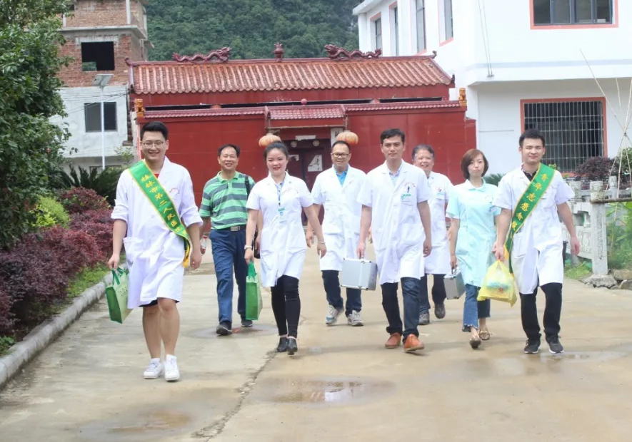 李莉(图中左三)带领医疗专家及青年志愿者下乡开展医疗扶贫工作