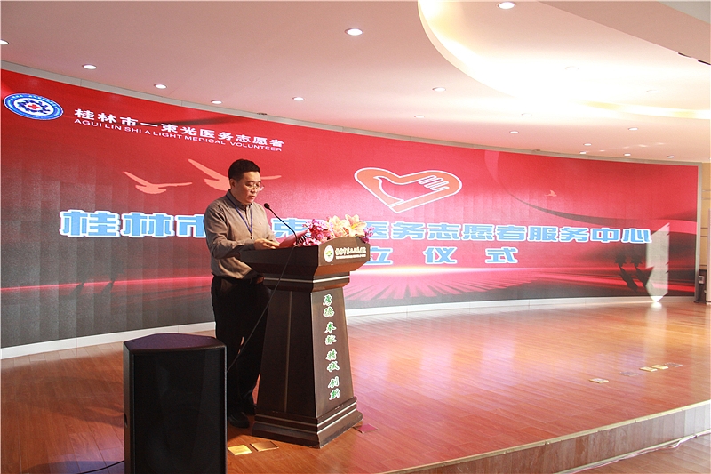在成立仪式上,桂林市第二人民医院党委书记何毅代表医院党委向服务中心的成立和新当选的理事长、副理事长、全体理事表示热烈的祝贺!向积极投身志愿服务事业的朋友们表示崇高的敬意!志愿者服务是一项崇高而光荣的事业,体现了一个社会的信仰,代表着一个城市的文明程度。桂林市“一束光”医务志愿者服务中心的成立,给了医务工作者以及有志于自愿者服务的人们一个奉献社会的平台,给了他们学以致用、锻炼自己、提升自我的机遇。我们欢迎和支持这样的平台建立,并积极地将这项活动发扬光大,争取成为桂林的一张名片。