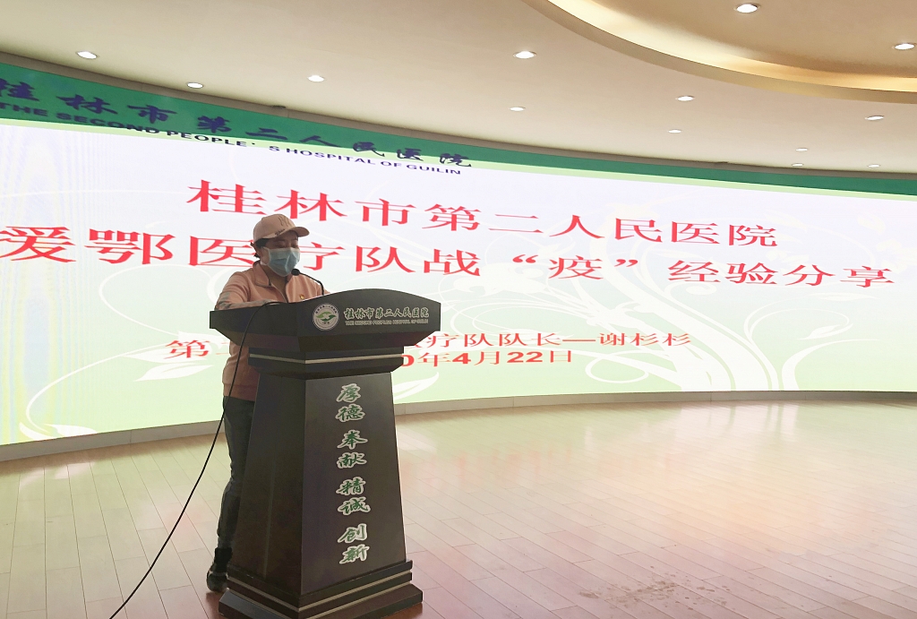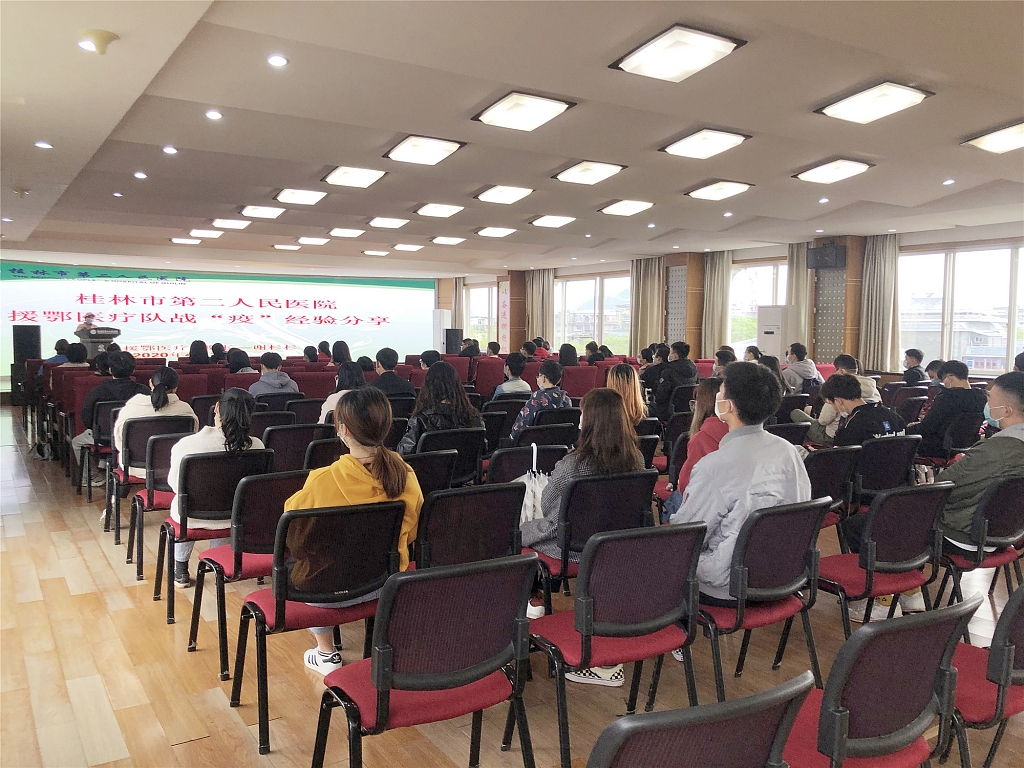 4月22日上午,桂林市第二人民医院开展实习生返岗培训,邀请了该院援湖北医疗队队员谢杉杉、黄彬彬为来自广西中医药大学、广西科技大学、桂林医学院、右江民族医学院的70多名实习生们讲述了他们在湖北一线抗疫经历和抗疫故事,分享医疗队的战“疫”经验和战“疫”初心,传递职业奉献精神。