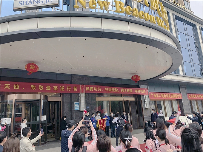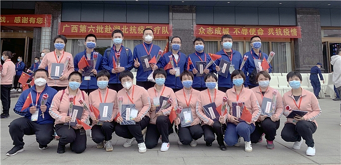 当天上午,在队员们离开武汉前,武汉市政府为他们举行了简短的欢送仪式,感谢他们为武汉抗“疫”做出的巨大贡献,武汉市人民政府向广西对口支援武汉医疗队颁授锦旗。桂林市第二人民医院医疗队员谢杉杉说,这份沉甸甸的荣誉见证了我与战友们在武汉共同战斗过的经历,承载了日夜奋战在一线医务工作者的心血与汗水,这段难忘的经历将深深铭记在我的心中;此次支援湖北之行,感受到了团结一心、众志成城的力量坚不可摧;在湖北的30余天,桂林大后方和湖北人民给与了无微不至的关心和关怀,让前线队员们全身心投入到抗击疫情的战斗中,让胜利曙光早日到来。