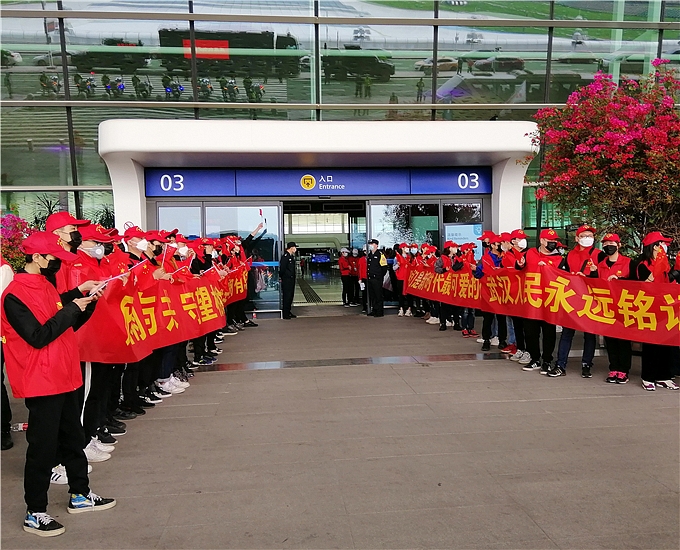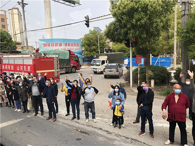 仪式结束后,队员们统一乘坐大巴前往机场,武汉交警以最高的规格为“白衣战士”护航,一路上武汉市市民在居民楼上高呼相送“感谢广西,雪中送炭”,当地公安、消防列队敬礼,向这些在“武汉拼过命”的医务人员致以崇高的敬意。