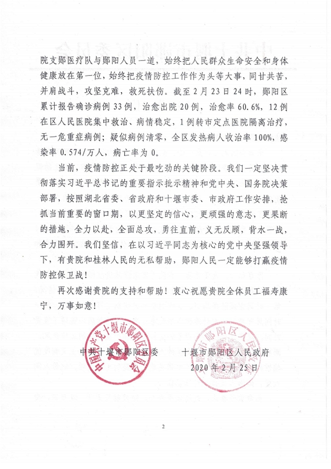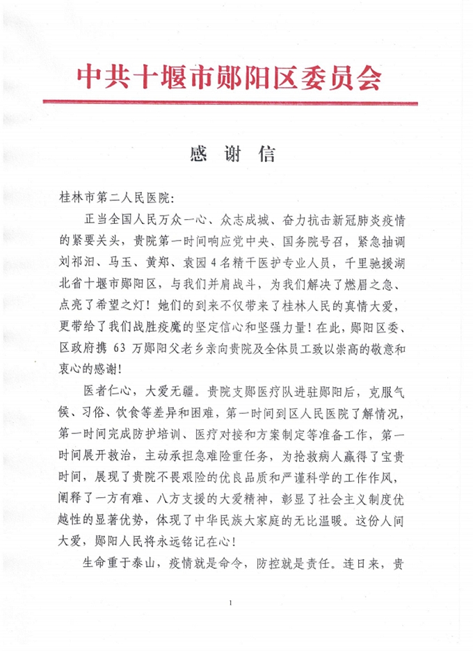 2月25日,桂林市第二人民医院收到一封自湖北省十堰市郧阳区区委、区政府传真过来的感谢信。信中高度赞扬了市第二人民医院首批4名支援十堰市郧阳区人民医院医疗队员抗击疫情的事迹。同时,信中多次提到这4名医疗队员勇于担当,无畏向前,医者仁心的高尚品质与大爱无疆的精神。在与疫情抗击的日日夜夜里,“桂”人为郧阳区人民带去了希望与信心,也在前线收获了许许多多感动与温暖。
