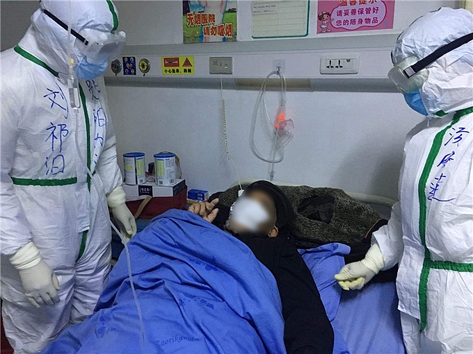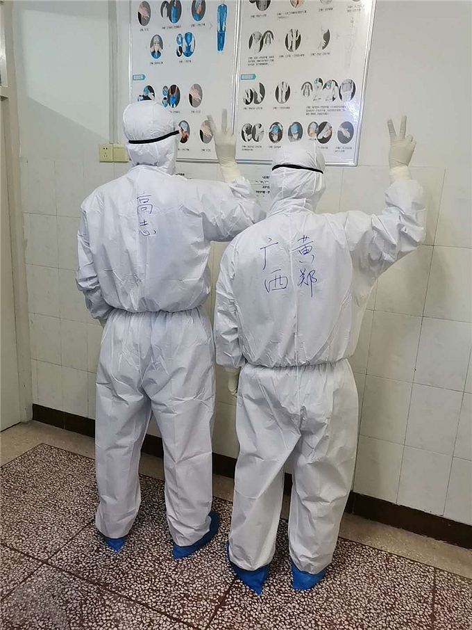 桂林市第二人民医院首批医疗队员黄郑与战友穿上隔离服准备进入病房