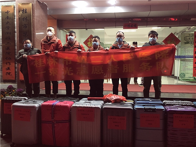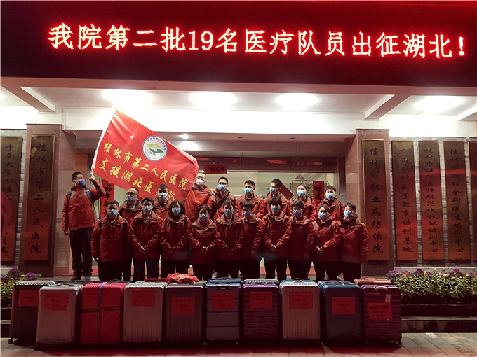 据了解,桂林市第二人民医院此次出征援湖北的19名医务人员整装待发赶赴湖北,至此医院共有23名医务人员前往支援一线。为了让大家在前线安心工作,桂林市第二人民医院将在医疗物资紧张的情况下,全力做好各支援湖北医务人员及其家庭的后勤保障工作。