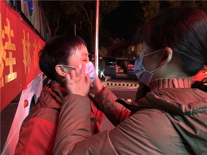 同为医务人员,温晶手扶着同科室即将奔赴湖北参战的同事陈小玉,却只能远远望着出征的丈夫登车
