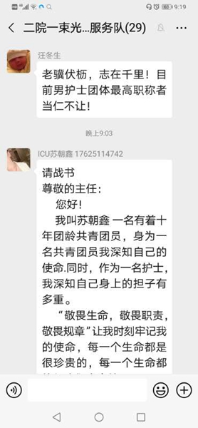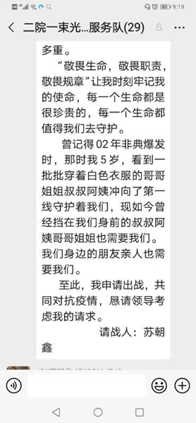 尊敬的主任,你好!我叫苏朝鑫,是一名有着十年的共青团员,…..“敬畏生命,敬畏职责,敬畏规章”让我时刻牢记我的使命,每一个生命都是很珍贵的,每一个生命都值得我们去守护。曾记得非典爆发的时候,我才只有5岁,看到一批批穿着白色衣服的哥哥姐姐叔叔阿姨冲向第一线守护我们,现如今他们也需要我们,我们身边的朋友亲人也需要我们。至此,我申请出战,共同对抗疫情,恳请领导考虑我的参战请求。