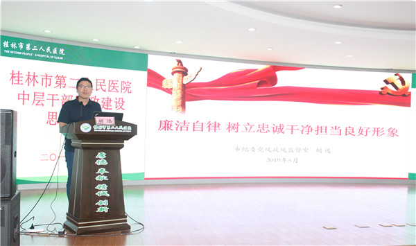 为加强医院党风廉政建设教育,扎实推进党风廉政建设工作。5月30日,我院邀请桂林市纪委党风政风监督室主任胡迅对我院中层干部、科主任、护士长、全体党员及团干300余人进行廉政建设思想教育讲座。讲座由医院纪委书记赖玉珊主持。