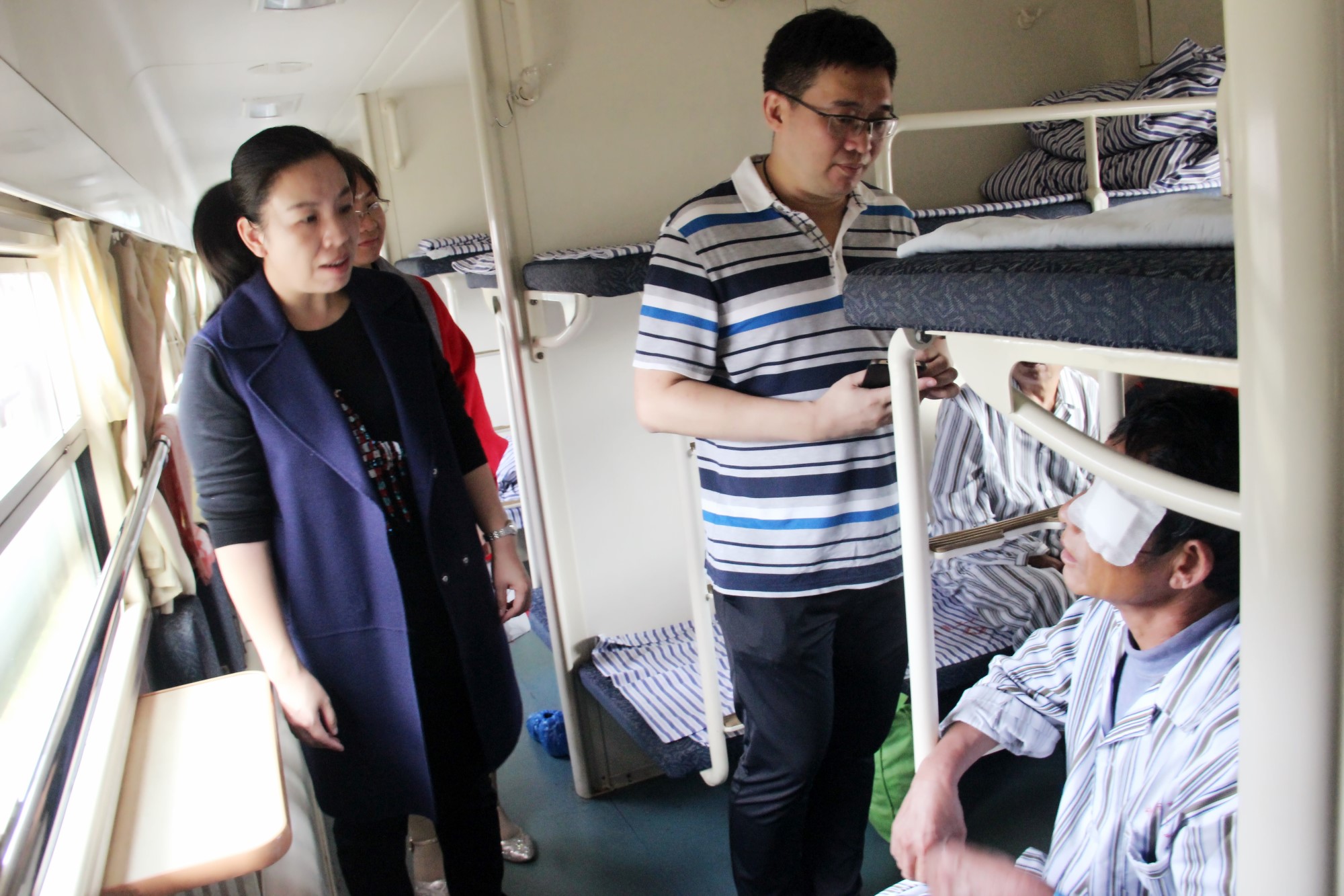 市卫计委副调研员蒋基权和市残联副理事长李孝平在列车上和患者亲切交谈