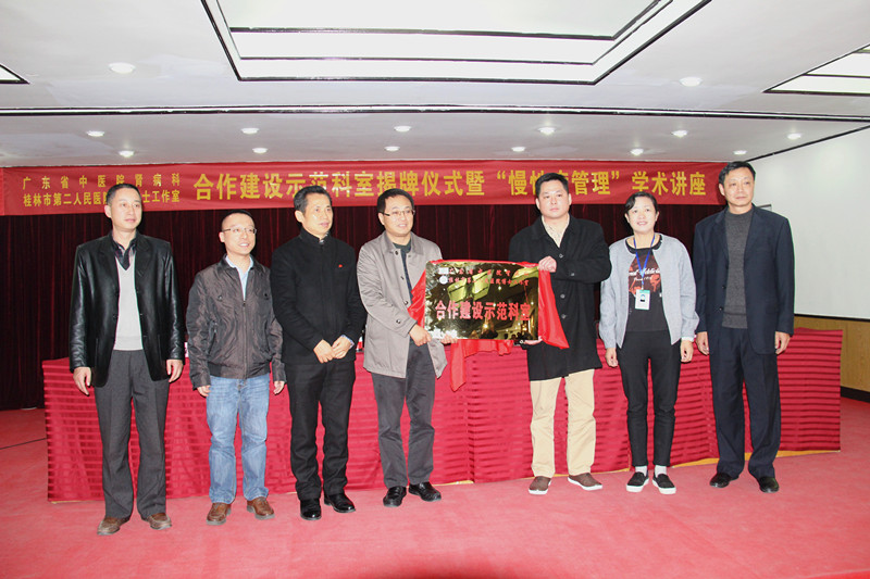 广东省中医院肾病科与我院中医博士工作室举行合作揭牌仪式,开启了两方的正式合作。今后,在科室管理、人才培养、业务技术等方面将会更好地得到广东省中医院肾病科的指导和帮助,有力促进医院在中医肾病方面医疗技术水平的发展与提高。我院将充分依托广东省中医院肾病科精湛的中医技术优势、强大的专家团队,强化学科建设、加快人才培养、提升服务品质,不断提高中医肾病在全市的影响力、辐射力和凝聚力,进一步挖掘中医、提升中医、传播中医、运用中医,使医院在中医专科建设、人才培养、管理等多方面得到大幅提升,创出更多自己的品牌与特色,为桂林市中医药卫生事业做出新的更大的贡献,让桂林周边的老百姓就近享受知名医院专家的诊疗护理服务。