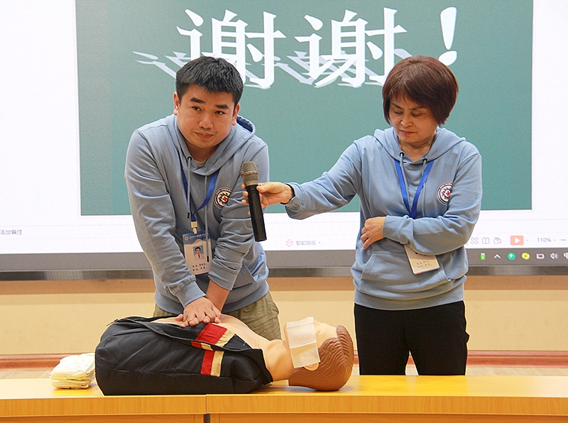 讲座结束后,急诊科团队的医护人员走上台,对心肺复苏术和“海姆立克急救法”做了标准的实操示范,通过通俗易懂的讲解,让学院的老师和同学们基本掌握了一些现场急救操作方法和要点。同学们听的认真,学得仔细,并为实操示范的医护人员送上热烈的掌声。
