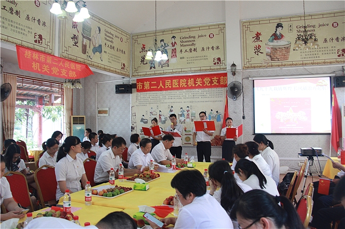 为庆祝中国共产党成立99周年,激发党组织活力,增强党组织的凝聚力,近日,桂林市第二人民医院机关党支部在鲁家村开展了“七一”主题党日+活动。机关党支部党员、入党积极分子等50余人参加了此次活动。
