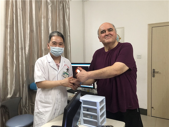 近日,在桂林市第二人民医院眼科中心,一位外国友人握住副院长、眼科中心主任温利辉的手,用蹩脚的中文对他说“谢谢”!感谢温利辉副院长为他的眼睛进行手术,恢复视力。