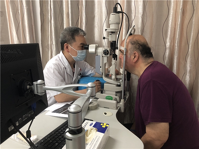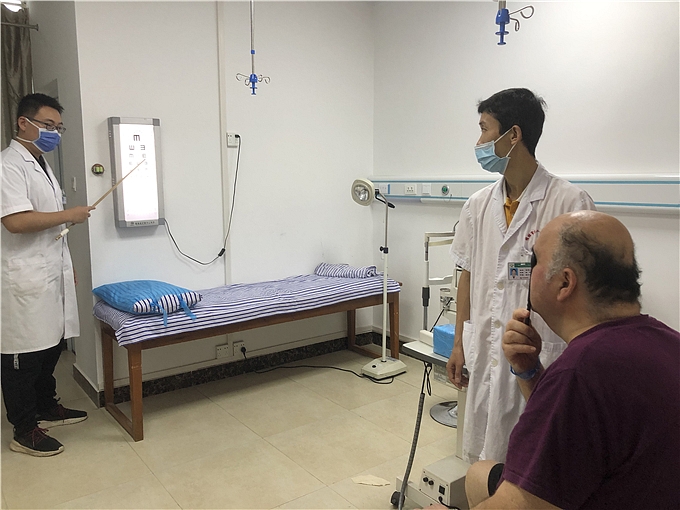 副院长、眼科中心主任温利辉为患者GIACOMO GEI做术后视力检查