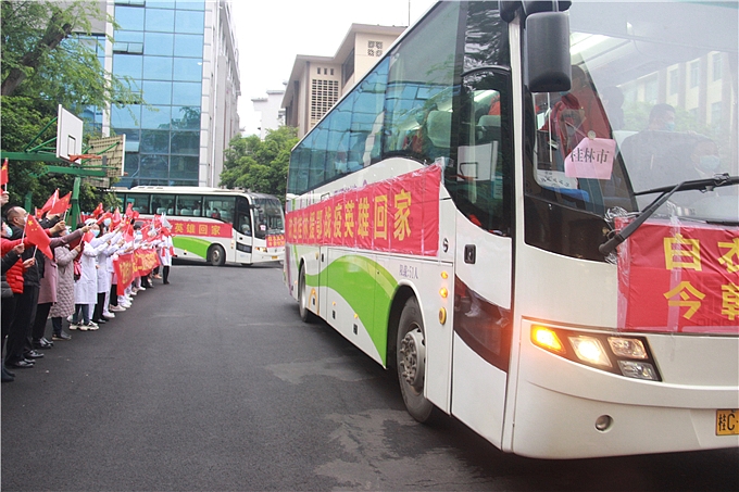 4月4日下午,桂林市市直首批支援湖北医疗队结束集中休整从南宁启程返回桂林。其中,包括桂林市市直支援湖北十堰市医疗队队长、市第二人民医院呼吸内科主任刘祁汨,队员马玉、黄郑、袁园,还有第二批预防组感控专家黄彬彬。