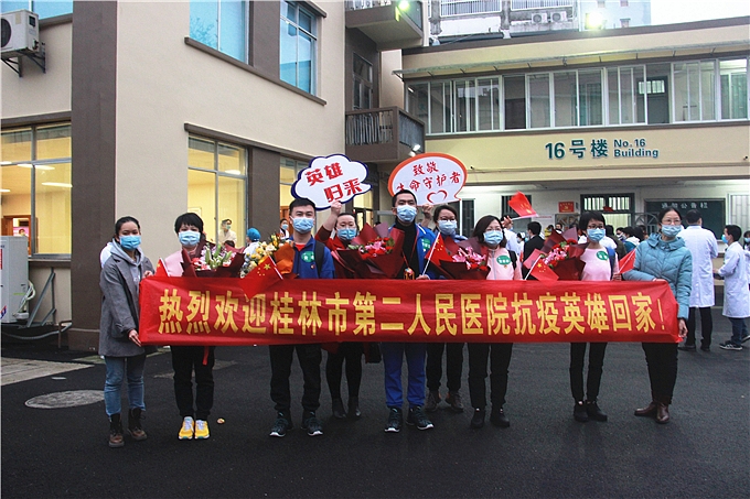 在警车开道下,在全城市民瞩目下,医疗队员随车回到桂林,市第二人民医院院长及相关领导到场迎接。久别的重逢,他们和家人、同事紧紧相拥,笑声和泪水相织,尽情倾诉离别之情,一幕幕团聚的画面令人感动不已。