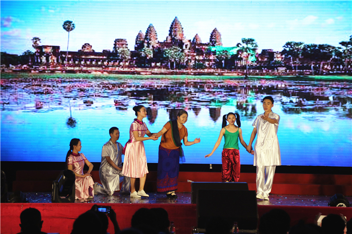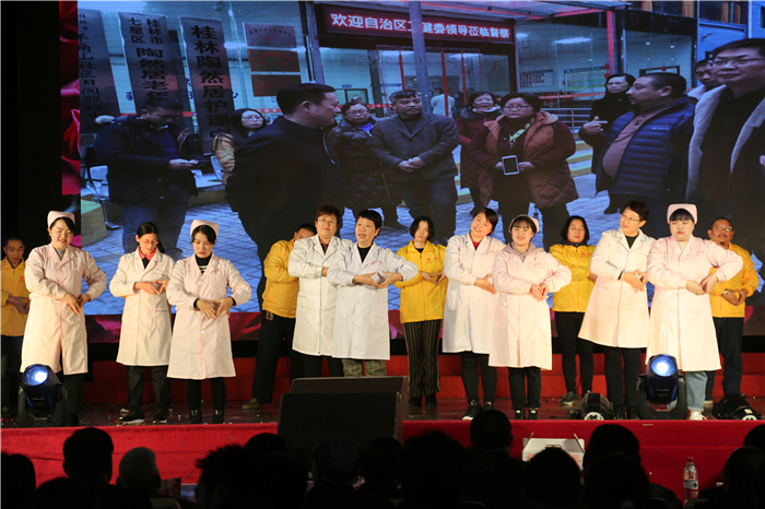 晚会在锣鼓声中拉开帷幕,医院领导班子首先登场,以大合唱《红旗飘飘》将观众的视野聚焦到舞台。晚会节目有舞蹈、歌曲、相声等,每一个节目是大家自编自演的。原创情景剧《光明使者出国门》展现了桂林市第二人民医院组织医疗队两次走出国门,赴柬埔寨为贫困人群开展白内障复明手术的感人情景,剧情不仅展现了医务人员大爱无疆、救死扶伤的大医精神,也展现了“一带一路”让中柬人民拥有了更深的情谊。