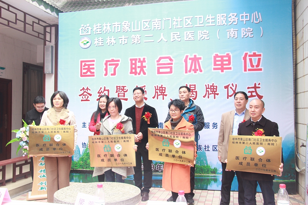 12月4日,桂林市第二人民医院南门社区卫生服务中心(南院)和所辖的天鹅、龙船平、翠竹、民族4个卫生服务站建立医疗联合体签约暨授牌仪式在南门社区卫生服务中心举行。