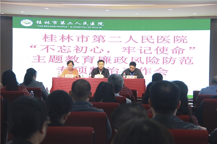 医院纪委书记赖玉珊在大会上传达了桂林市卫健委“不忘初心 牢记使命”主题教育廉政风险防范会议精神。