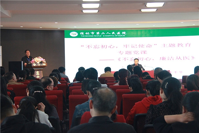在会上,蒋平华主任向与会人员做了题为《不忘初心 廉洁从医》的授课。他结合我们参观天津支援桂林图片展和广西党组织成长的光荣之路主题展播及卫生系统一些典型案例等进行了详细的讲解,针对作为一名医务人员如何立足岗位、不忘初心,做到心系百姓、廉洁从医进行了答疑解惑。蒋平华主任强调,务必牢记习近平总书记在“不忘初心、牢记使命”主题教育工作会议上明确提出主题教育的十二字总要求:“守初心、担使命,找差距、抓落实”;要提高政治站位,落实主体责任;坚持严管和厚爱相结合;要学深悟透。