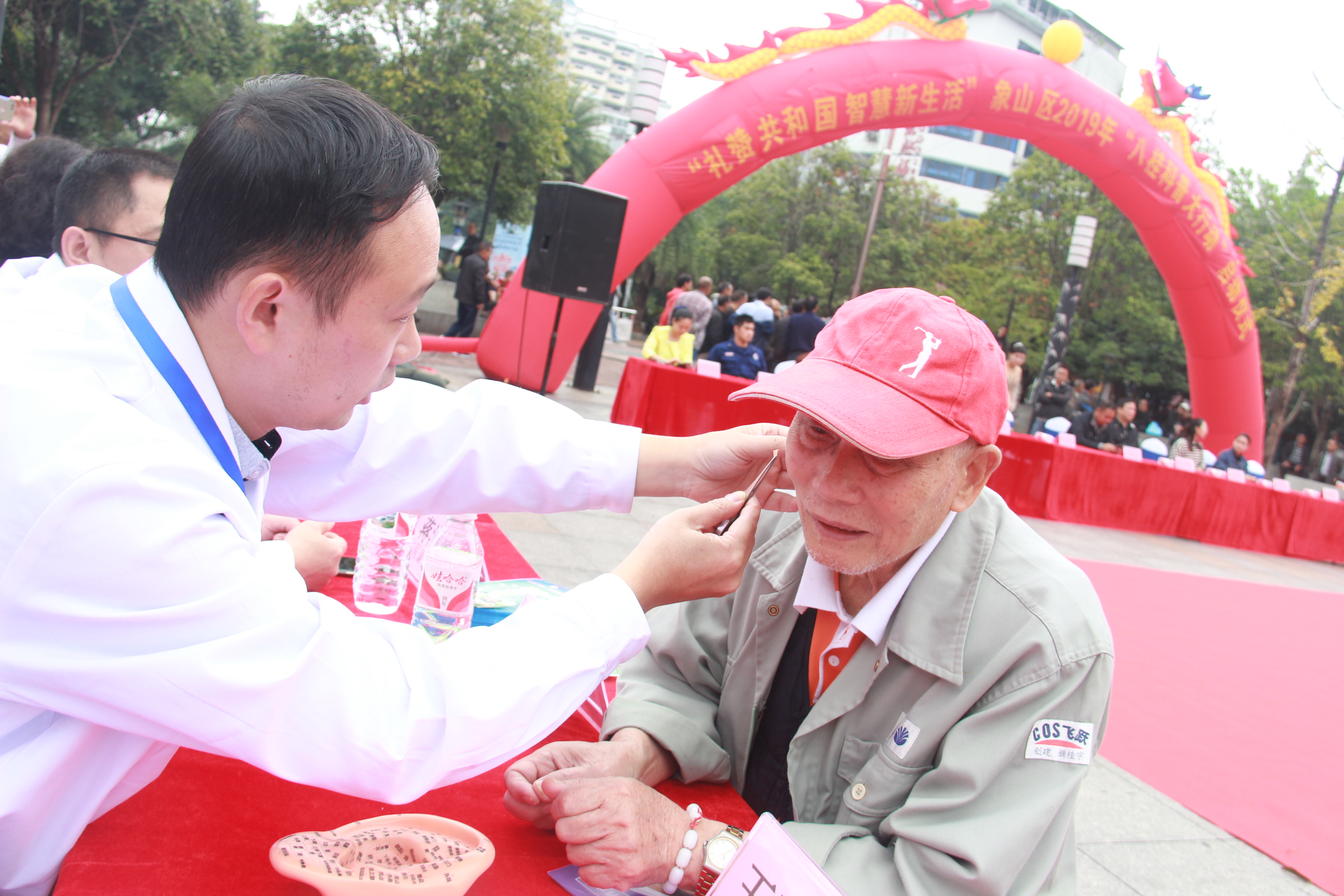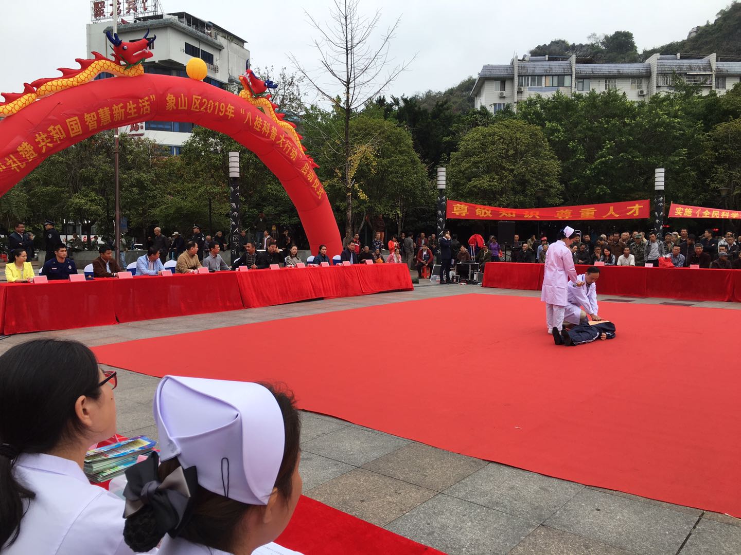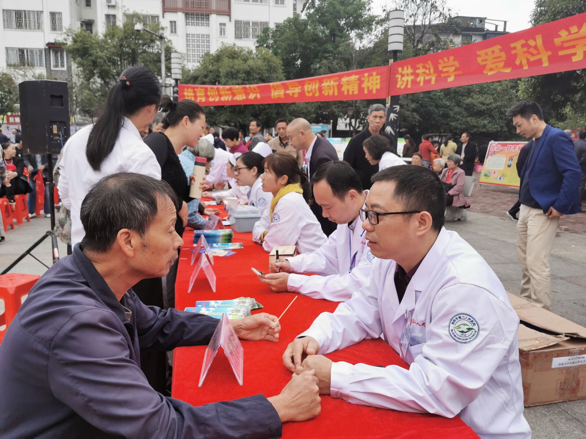 现场气氛热烈,共展出20条科普宣传标语、30块科普展板营造了浓厚的科普氛围。桂林银海医院、南门社区卫生服务中心(桂林市第二人民医院南院)义诊服务台早已被闻讯赶来的辖区群众围得水泄不通,把脉、问诊、量血压,免费测血糖等诊疗服务,医护人员积极为辖区群众宣讲疾病防治知识,接受健康咨询服务。桂林市第二人民医院南院还在现场进行了急救演练,教会现场的近千名观众如何第一时间现场进行心肺复苏抢救病人,建议广大市民朋友早日戒烟、戒酒、规律锻炼、健康膳食,并适时控制血压、血糖等,预防心梗、脑卒中等疾病发生。