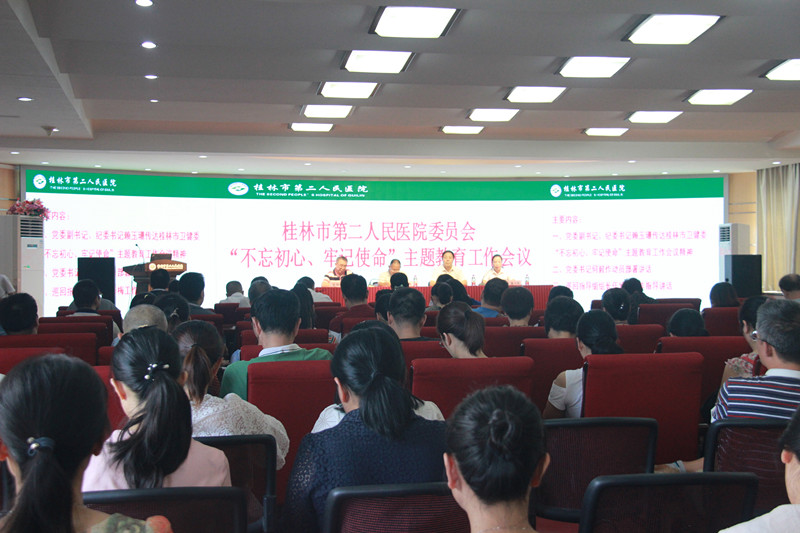 为深入学习贯彻习近平总书记重要讲话精神,按照桂林市卫生健康委员会“不忘初心、牢记使命”主题教育工作部署,近日,桂林市第二人民医院召开了“不忘初心、牢记使命”主题教育工作会,全面安排部署医院主题教育工作,并对全院党员干部进行了主题教育专题党课培训。桂林市卫生健康委第一巡回指导组组长伍华梅、医院党委书记何毅、院长颜丽萍等党政领导班子成员,各科室主任、护士长、支部书记等共200余人参加会议,会议由党委副书记赖玉珊主持。