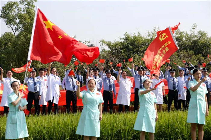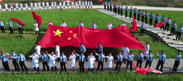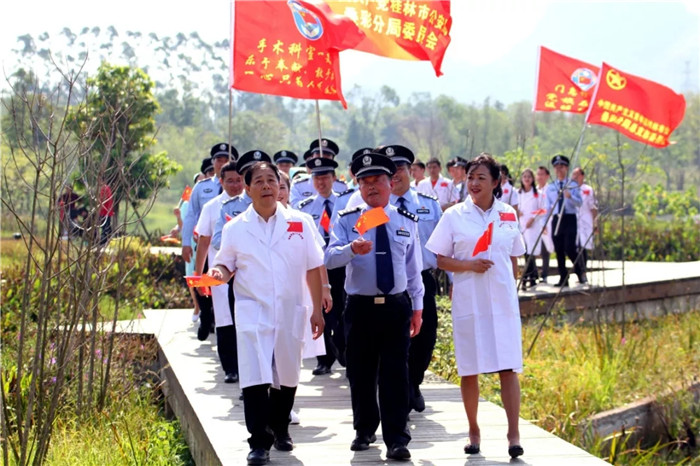 此次活动由桂林市叠彩区副区长、公安局叠彩分局局长谢俊及领导班子,桂林市第二人民医院党委书记何毅、院长颜丽萍及领导班子,带领近300名医务人员及公安干警组成“国旗护卫队”。大家高歌《我和我的祖国》,每个人手中都拿着五星红旗,望着高高飘扬的五星红旗,为祖国献礼。