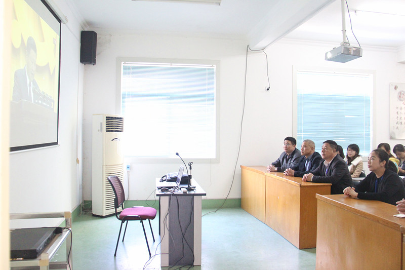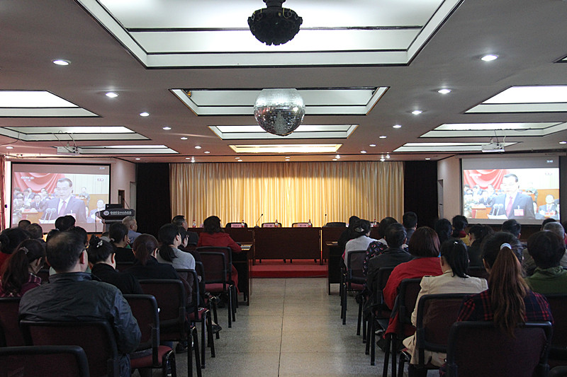 图为医院党委书记何毅、副书记赖玉珊等领导带领医院职工收看党的十九大召开