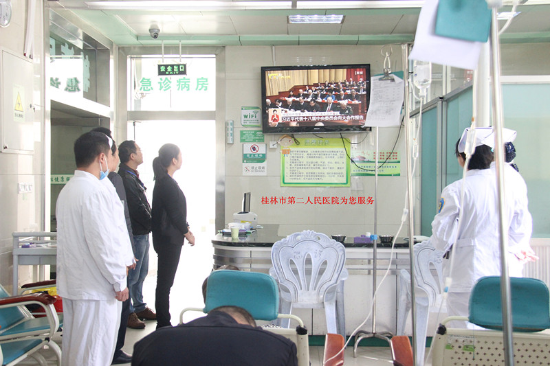 10月18日上午9时,中国共产党第十九次全国代表大会在人民大会堂隆重开幕,当天上午,桂林市第二人民医院组织院领导和职能科室中层在1号楼三楼会议室集中收看十九大开幕会直播。同时,医院病房、门诊楼等位点的电视也都在播放十九大直播,方便医务人员及患者收看。