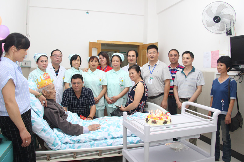 “祝你生日快乐!”6月9日,我院北院职能部门领导及内科全体医务人员推着生日蛋糕唱着生日歌来到病房,为住在该科阎鼎央大爷庆祝98岁生日。
