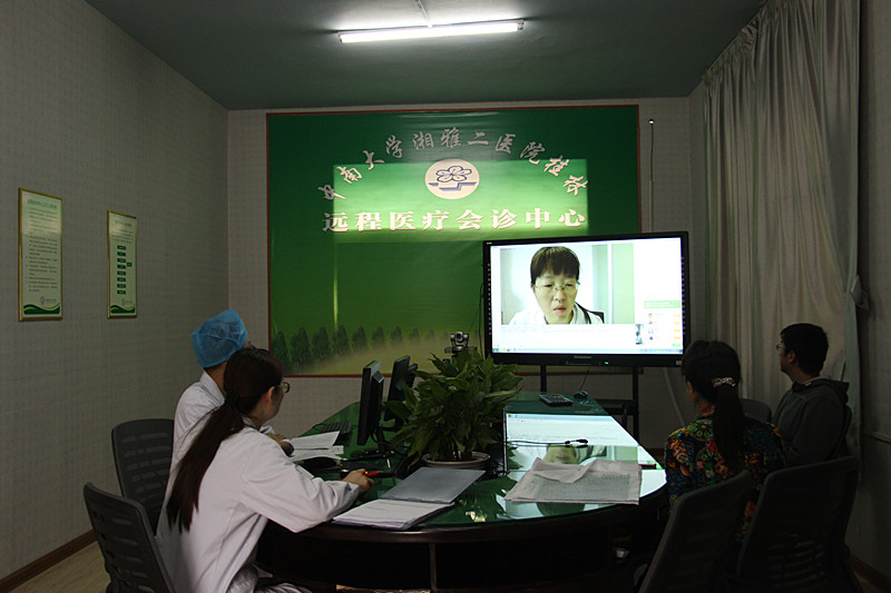 图为我院医务人员利用互联网设备与湘雅二医院专家就疑难病进行远程会诊.