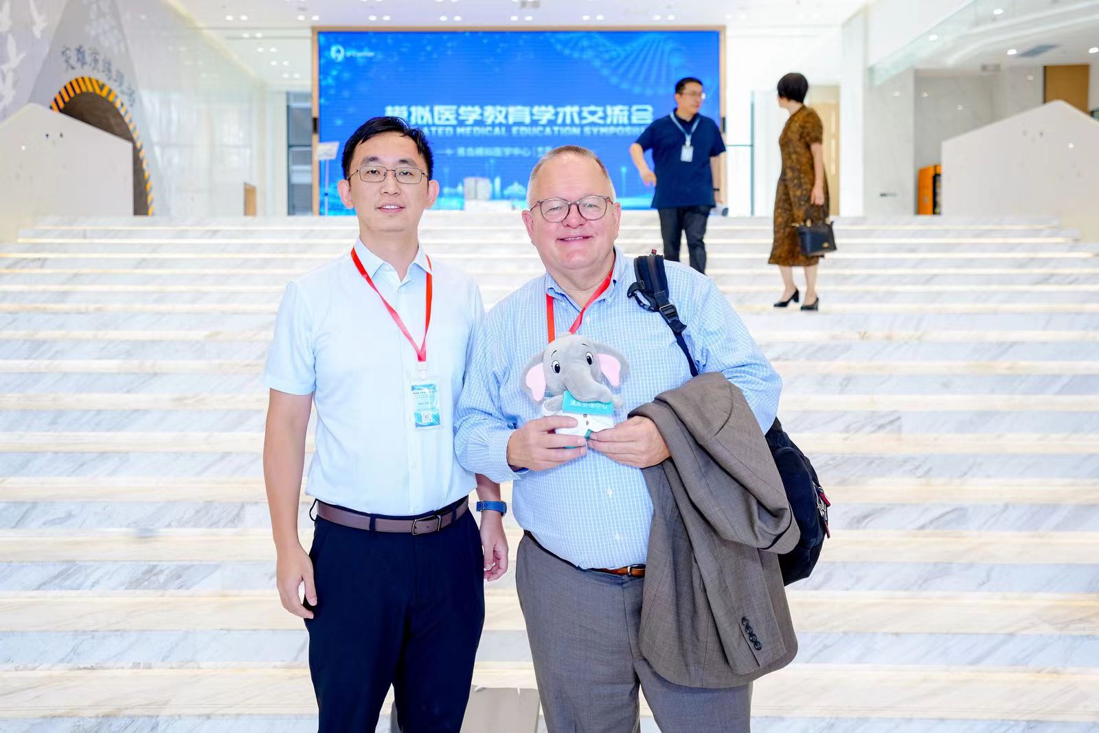张雨东向国际医学模拟协会前主席、美国匹兹堡大学Wiser中心的Paul Phrampus教授赠送医院吉祥物