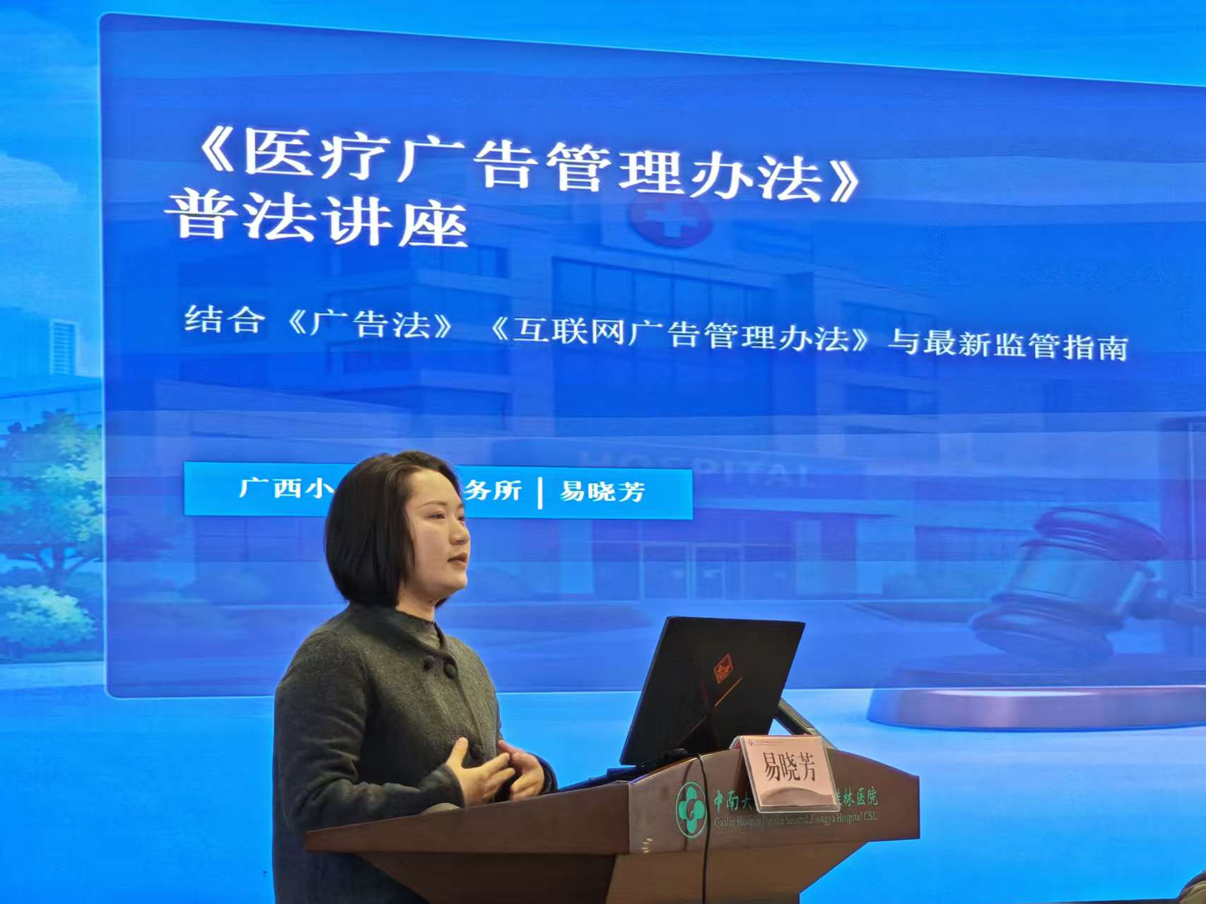 在医疗行业迈向高质量发展的今天,医疗广告的合规性不仅是法律的红线,更是医疗机构诚信经营的基石。为深入贯彻《中华人民共和国广告法》《医疗广告管理办法》等法律法规,进一步提升全院职工的法治素养,3月12日,中南大学湘雅二医院桂林医院邀请法律顾问,面向全院职工开展了“医疗广告法规”专题培训。