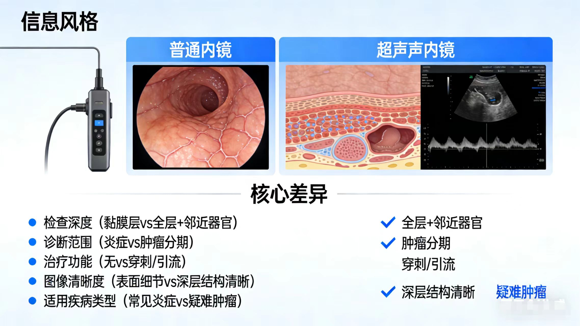 与腹部CT、磁共振相比,超声内镜凭借其“近距离扫描”的特点,对胃肠壁浅层病变及微小胰腺病灶的分辨率更具优势,还能实现“诊断与治疗”一体化操作,例如引导胰腺假性囊肿的穿刺引流。