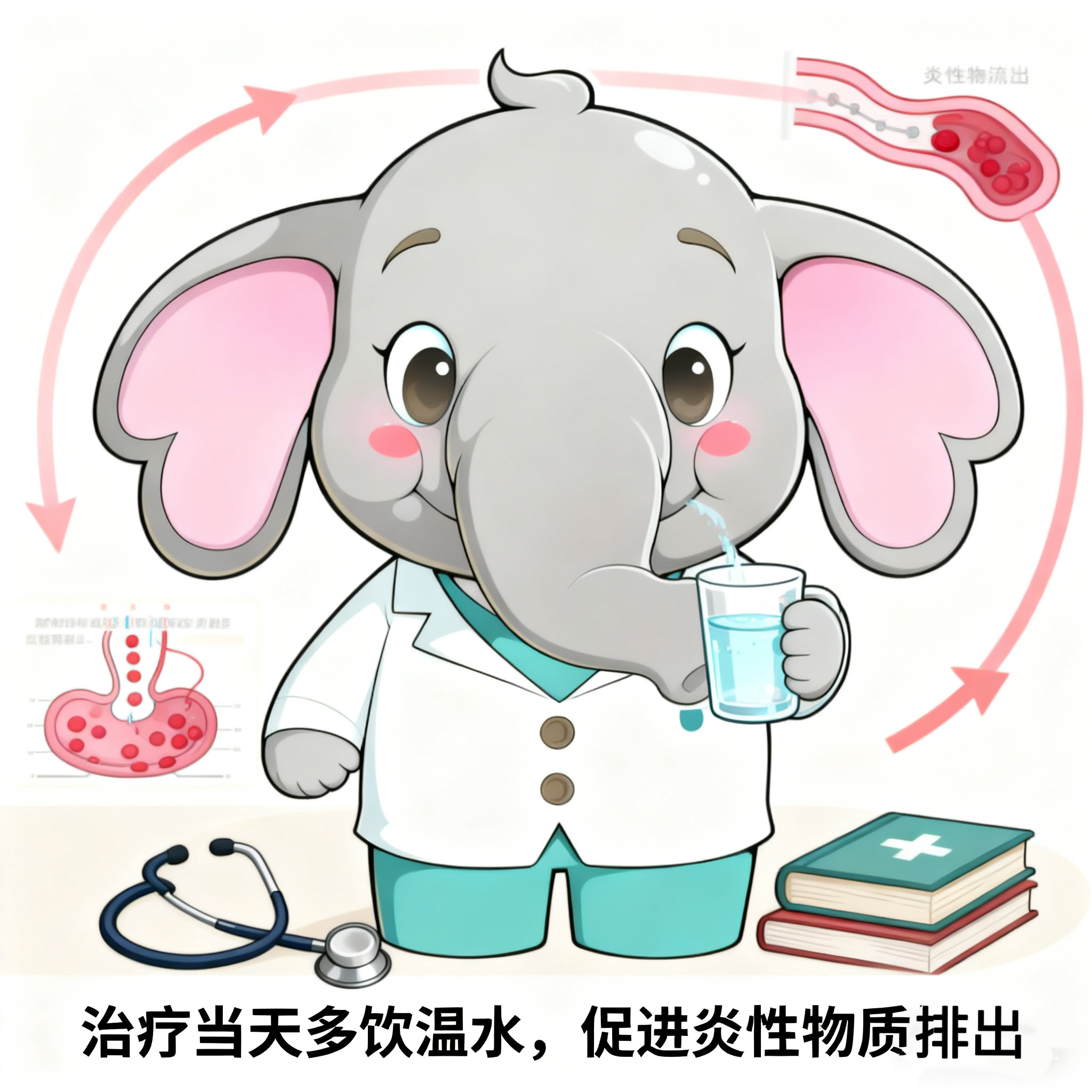 治疗当天请多喝温水,促进血液循环,帮助炎性物质排出;