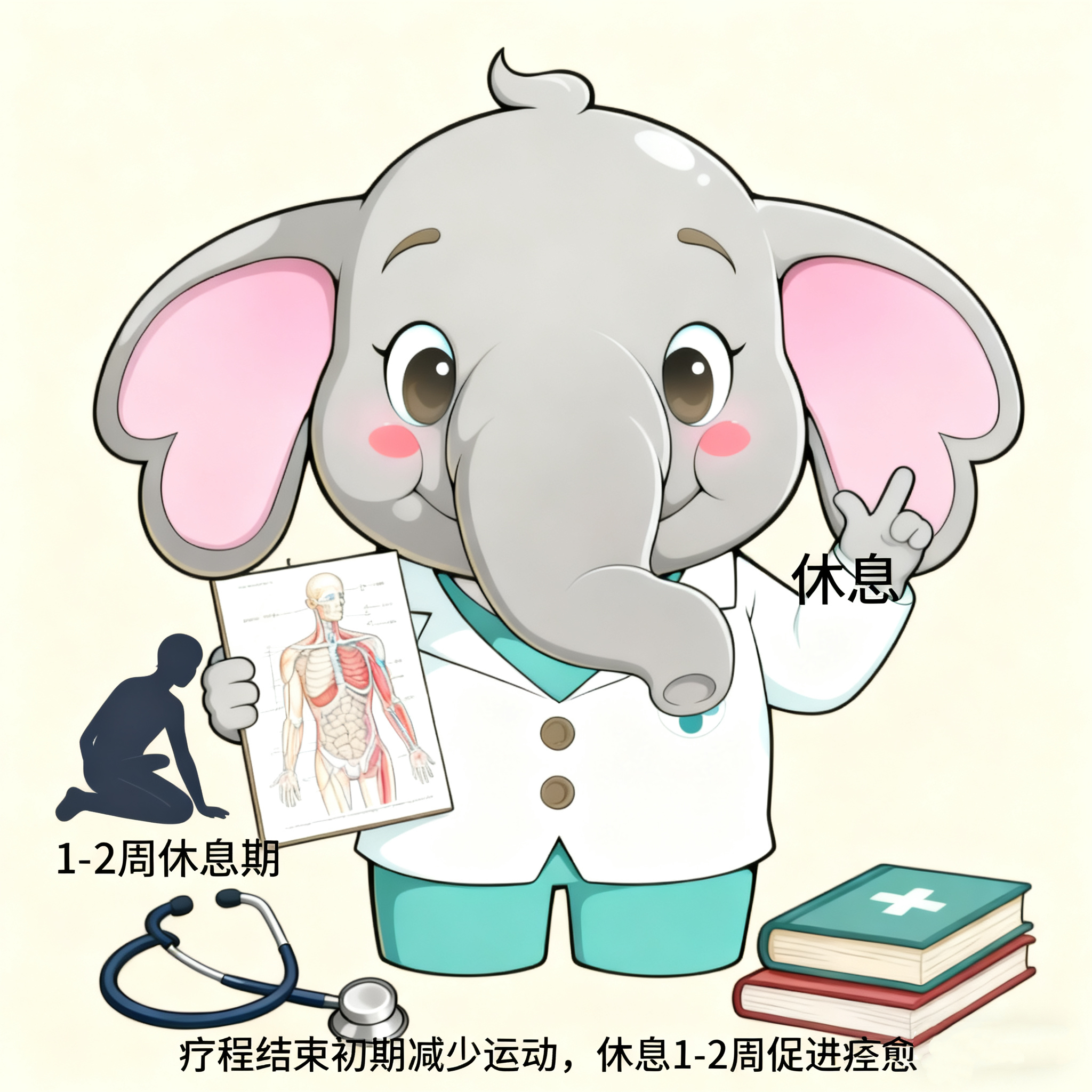 治疗期间应充分休息,在一个疗程结束后的初期,请尽量减少运动并避免治疗部位过度发力,建议休息1~2周,以确保该部位得到彻底修复。