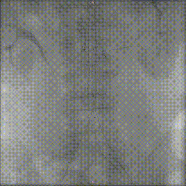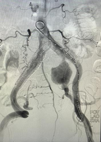 心脏问题解决后,治疗的“接力棒”交到了血管外科团队手中。团队预先在腹主动脉支架上为副肾动脉开窗并标记,随后在术中精准定位,将导丝导管通过开窗口超选入副肾动脉并成功植入支架,最终造影显示,腹主动脉瘤被完全隔绝,副肾动脉血流通畅,且无内漏。术后,患者肾功能维持良好,平安出院。