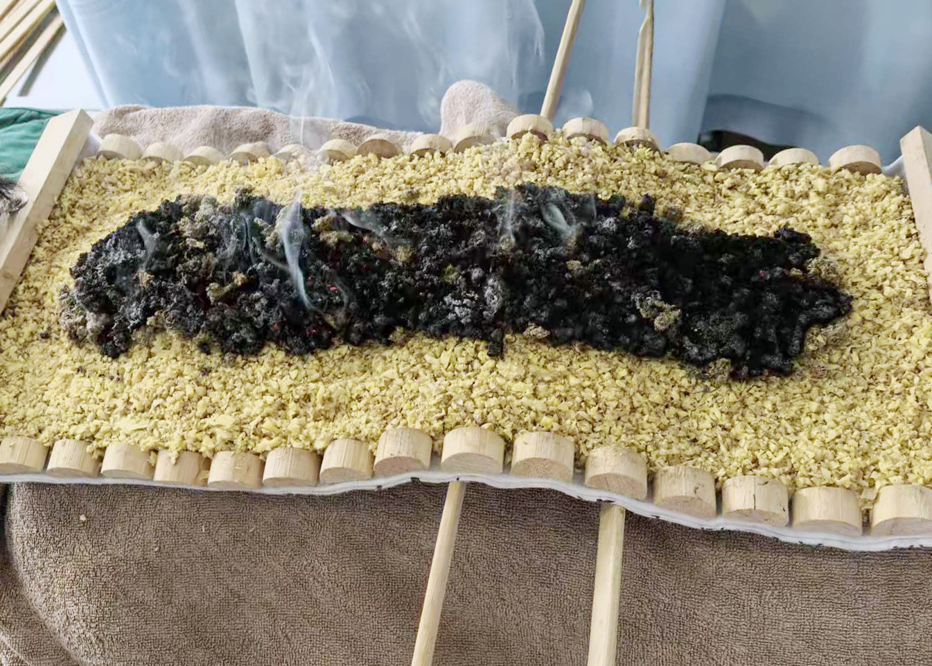 操作上,火龙灸讲究精准与有序,需要沿经络铺置姜泥与三至五壮艾绒,在周全防护下点燃。霎时间,一条婉转盘旋、喷云吐雾的“火龙”跃然于背,体内正气随之升腾。施灸过程中,温热之气如游龙般沿脊柱两侧自胸腹部、四肢逐渐扩散;灸毕再进行舒缓按压,既可得疗效,又享深度放松。