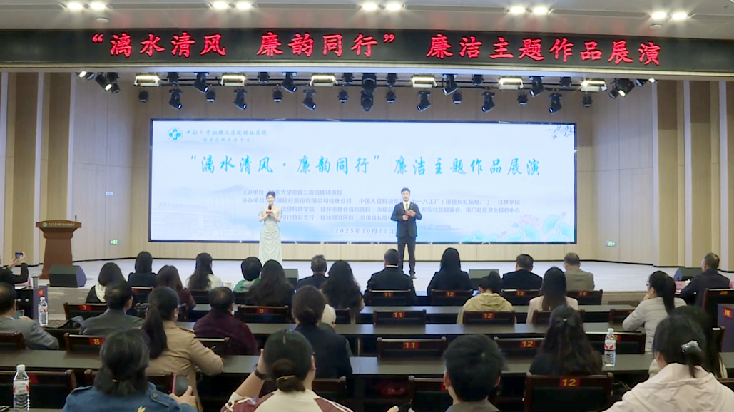 漓水含章,清风拂岸;廉韵悠扬,同心同行。10月22日,以“漓水清风・廉韵同行”为主题的作品展演活动在中南大学湘雅二医院桂林医院多功能厅精彩上演。这场由中南大学湘雅二医院桂林医院主办,10家党建共建、清廉共建、战略合作共建单位联合协办的展演活动,以多元艺术形式演绎廉洁内涵,为300余名共建单位干部职工呈现了一场兼具各领域行业特色与思想深度的廉洁文化盛宴,为推进新时代廉洁文化建设、构筑风清气正的政治生态注入强劲动力。