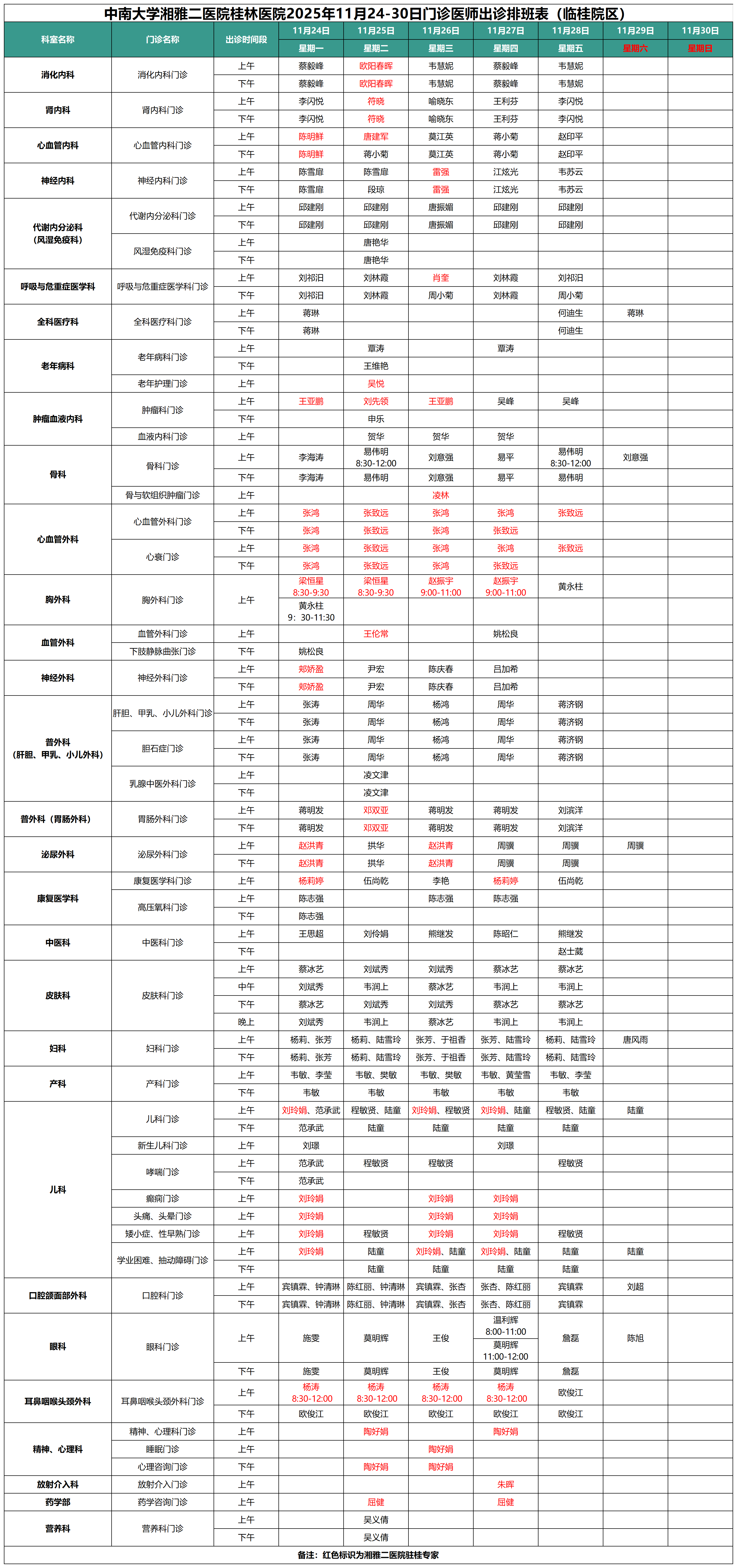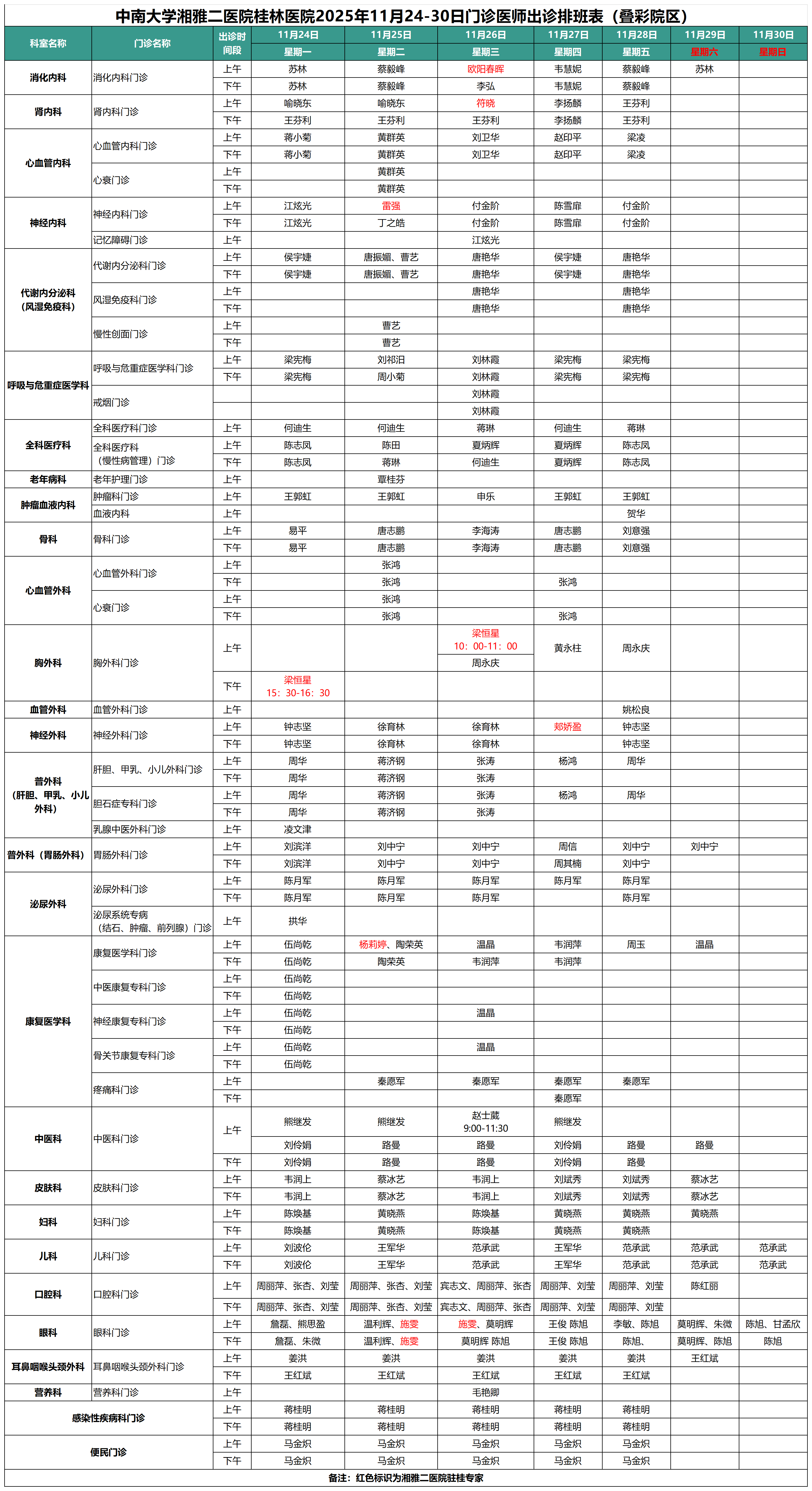 每周更新丨中南大学湘雅二医院桂林医院最新门诊出诊安排(11.24-11.30)