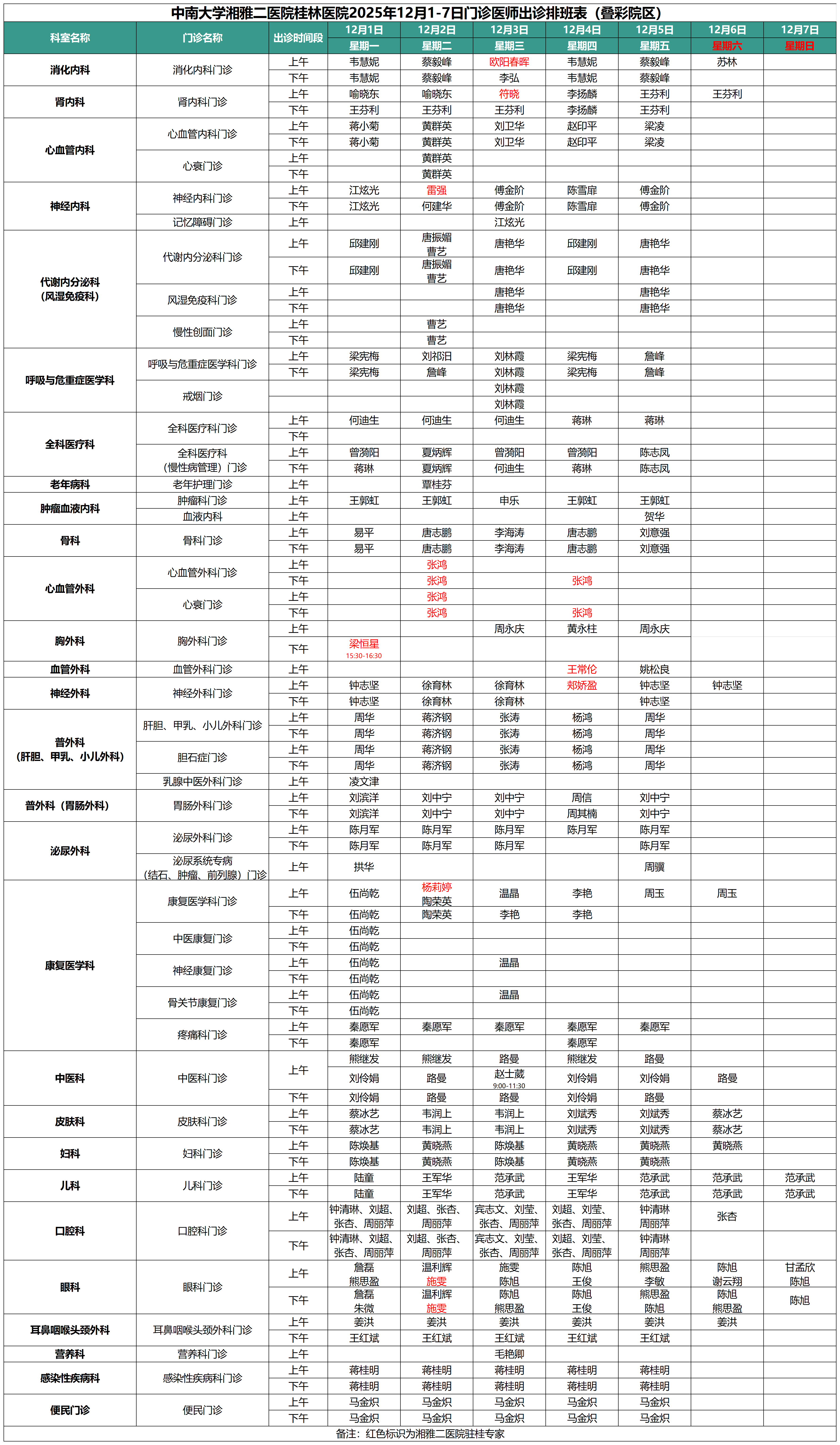 每周更新丨中南大学湘雅二医院桂林医院最新门诊出诊安排(12.1-12.7)