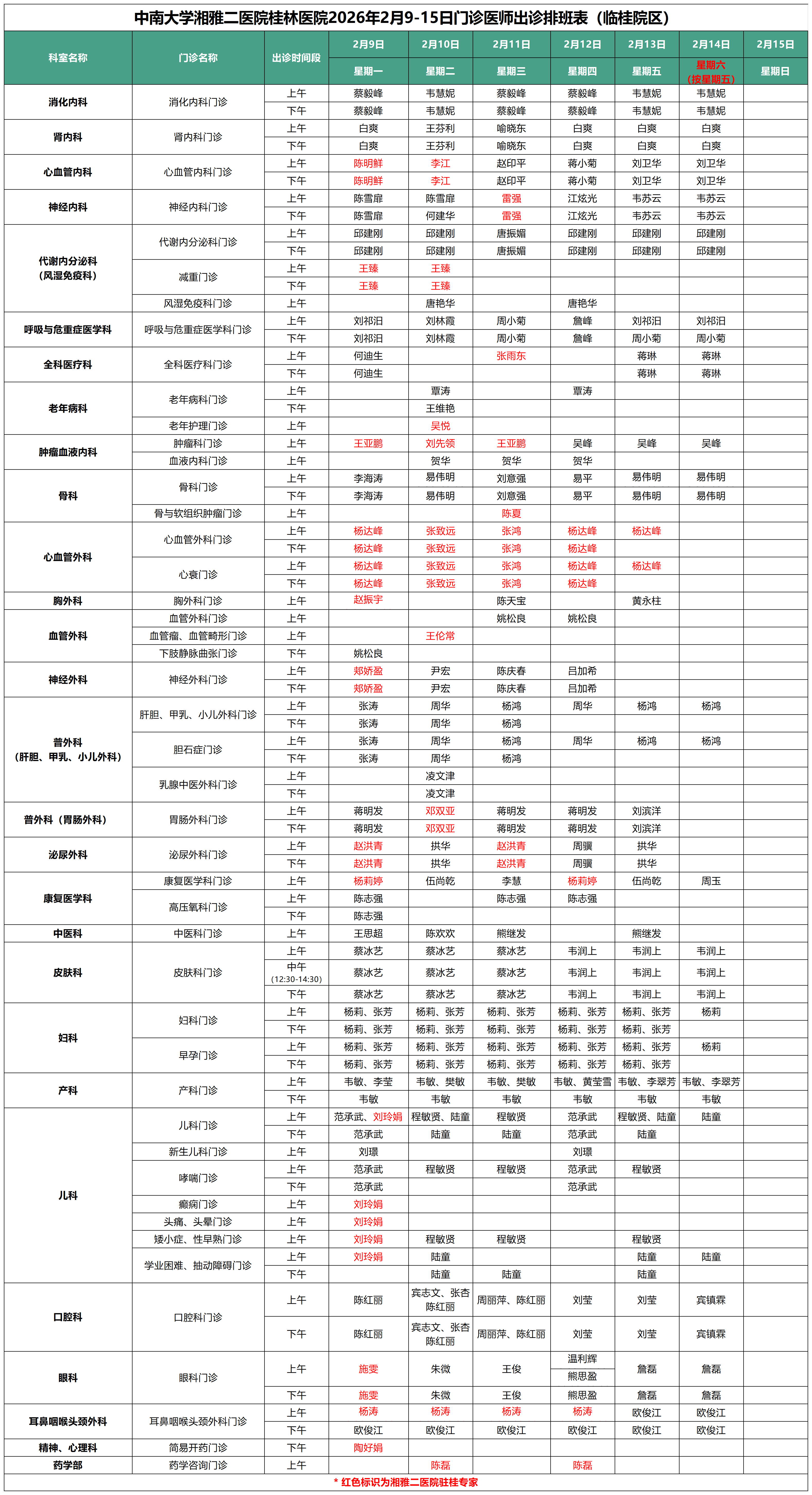每周更新丨中南大学湘雅二医院桂林医院最新门诊出诊安排(2.9-2.15)