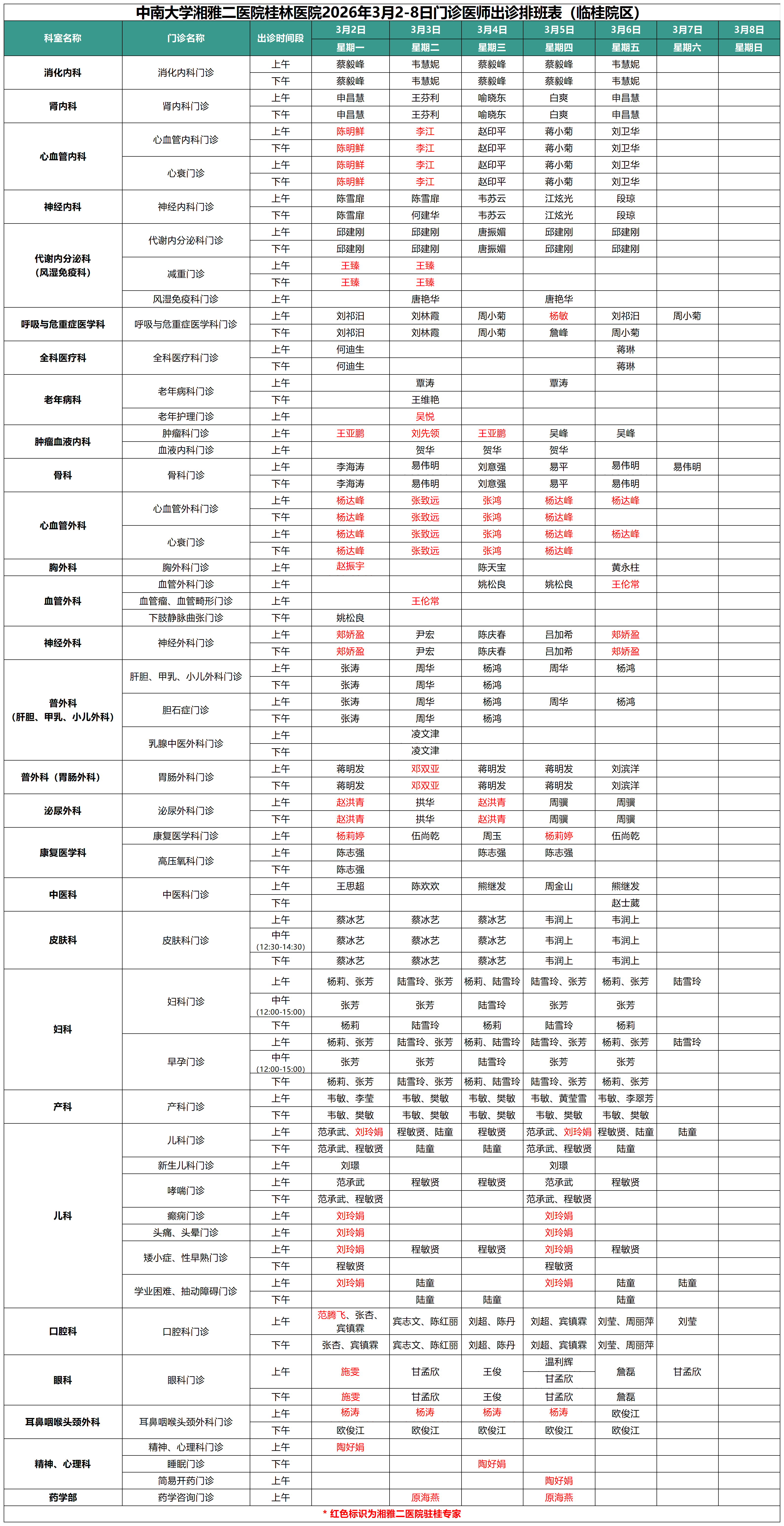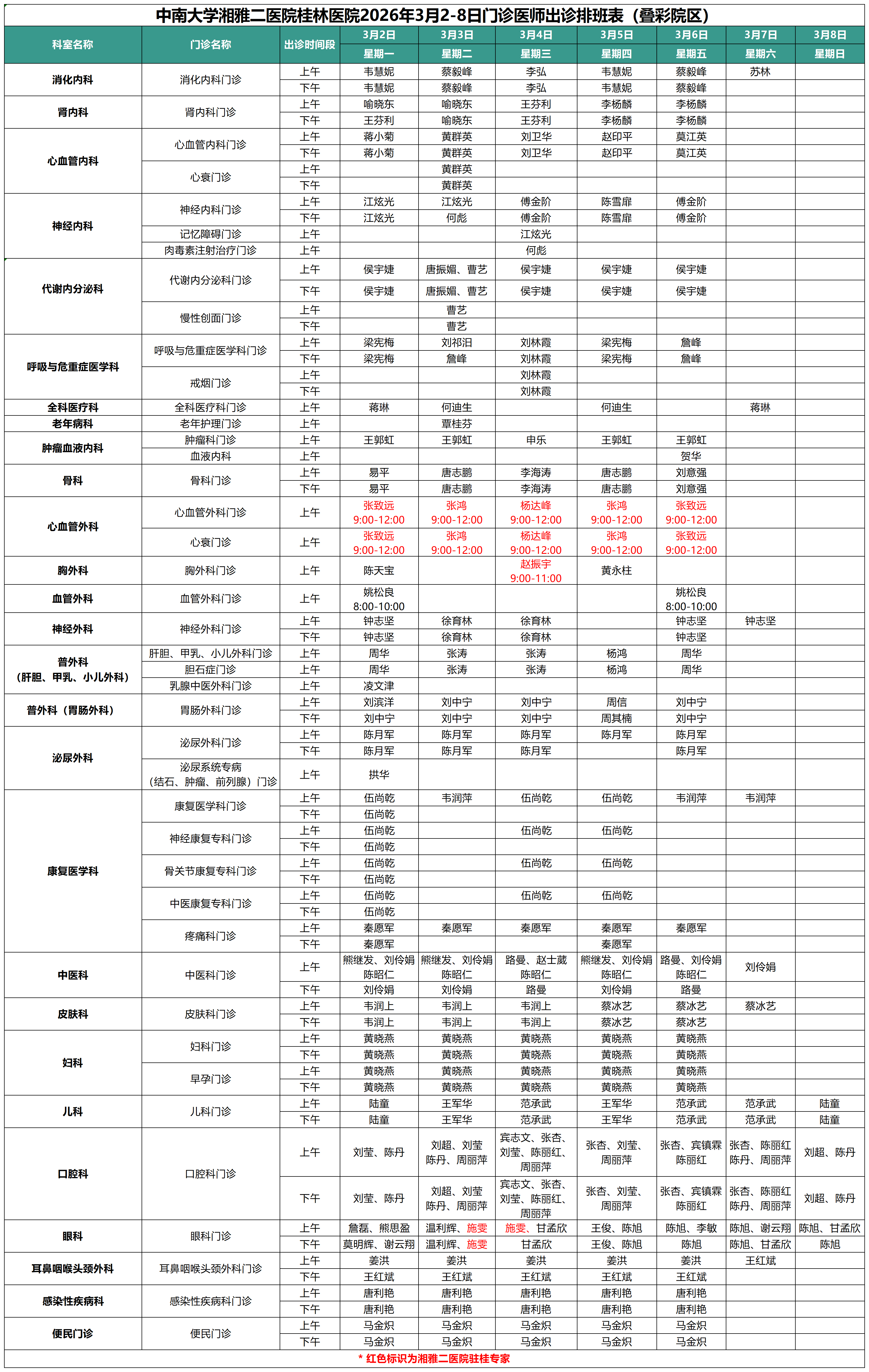 每周更新丨中南大学湘雅二医院桂林医院最新门诊出诊安排(3.2-3.8)