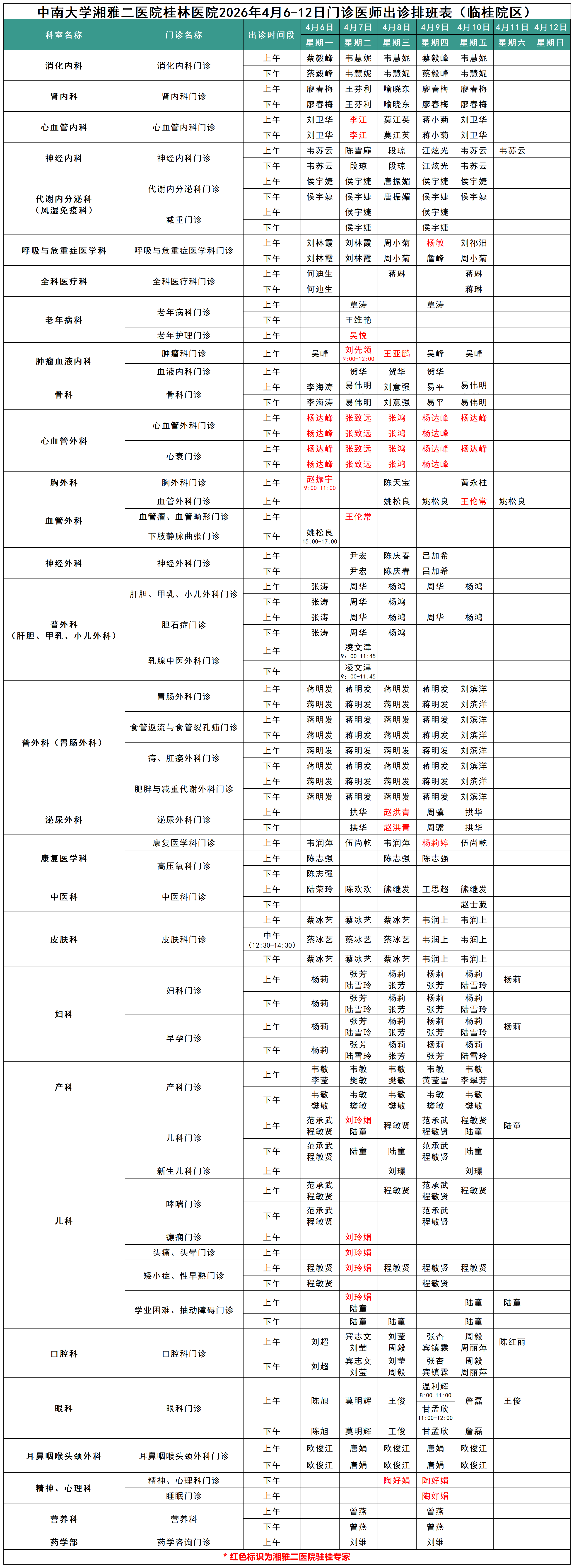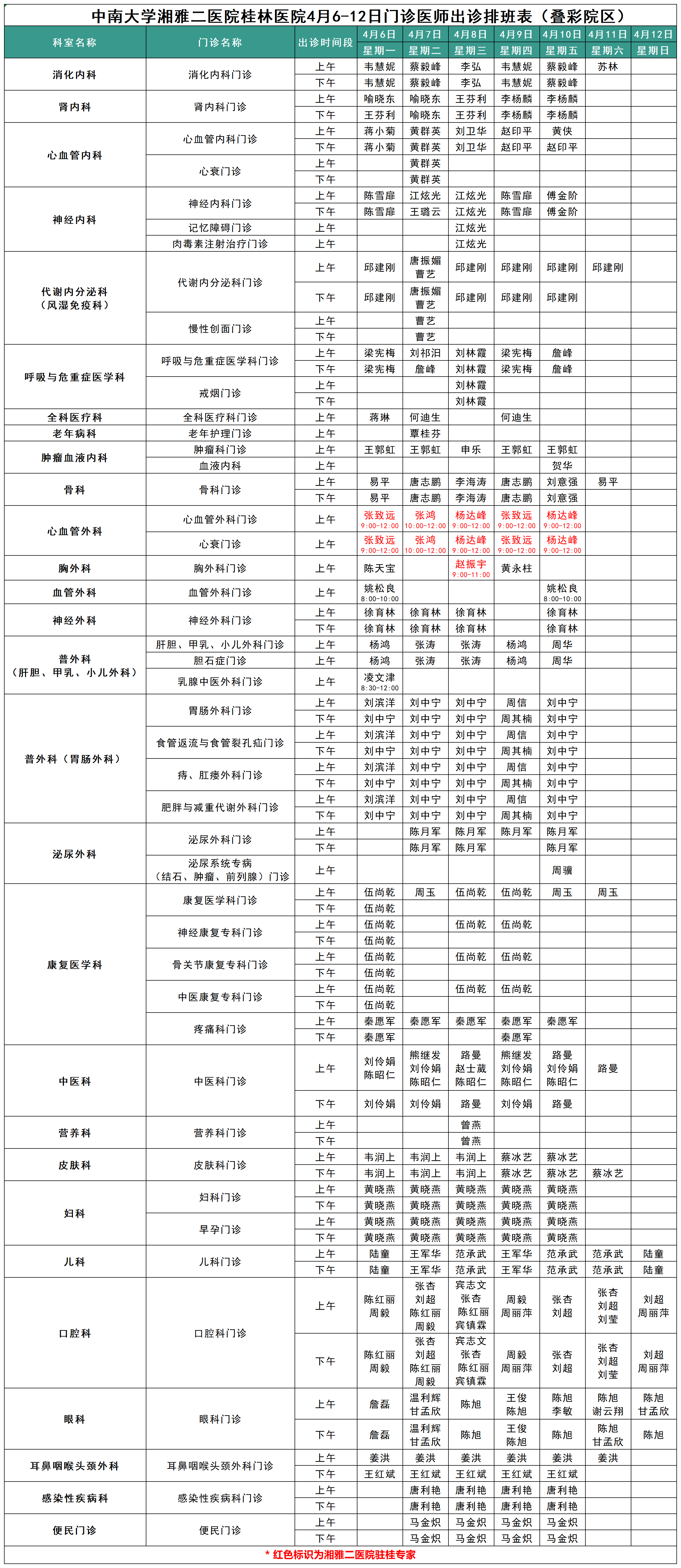 每周更新丨中南大学湘雅二医院桂林医院最新门诊出诊安排(4.6-4.12)