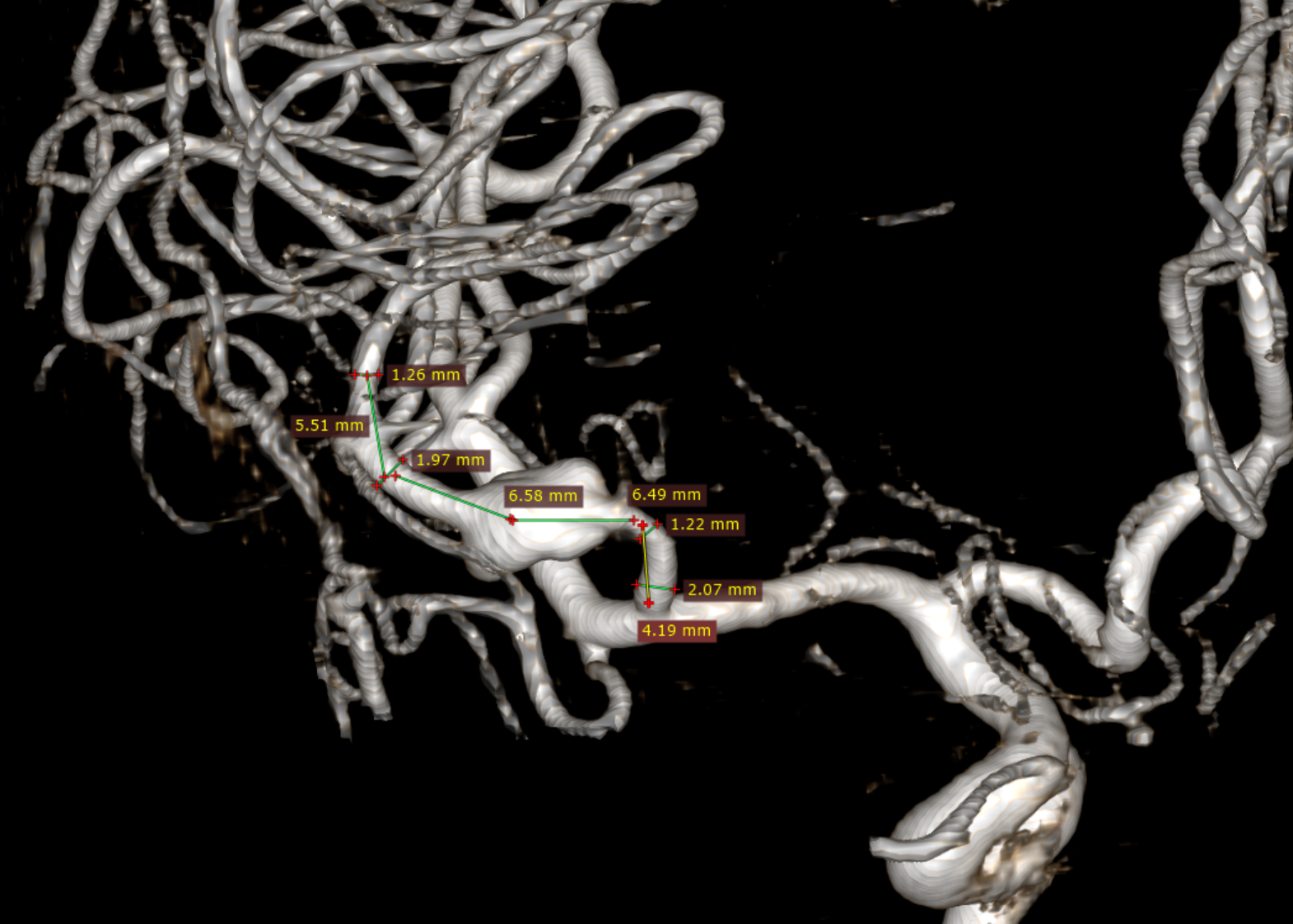 命运的意外转弯,总在不经意间降临。一名17岁的花季少女,本应在憧憬未来的年纪绽放青春,一次常规体检却意外查出了颅内深藏的“不定时炸 弹”——右侧大脑中动脉M2段有一颗大小约8mm×6mm的夹层动脉瘤,瘤周血栓环伺,情况危急。而承载血流的载瘤动脉最窄处仅剩1.2mm,如风中细丝般脆弱,随时可能断裂。